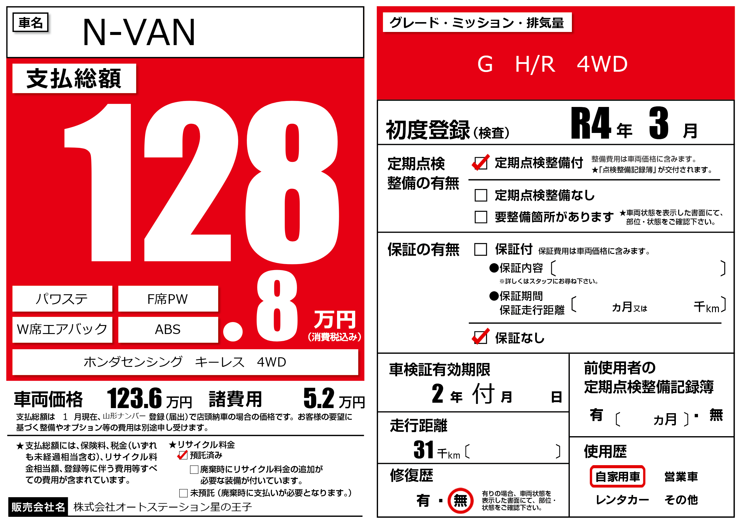 | 車名 | N-VAN | グレード ミッション 排気量 |