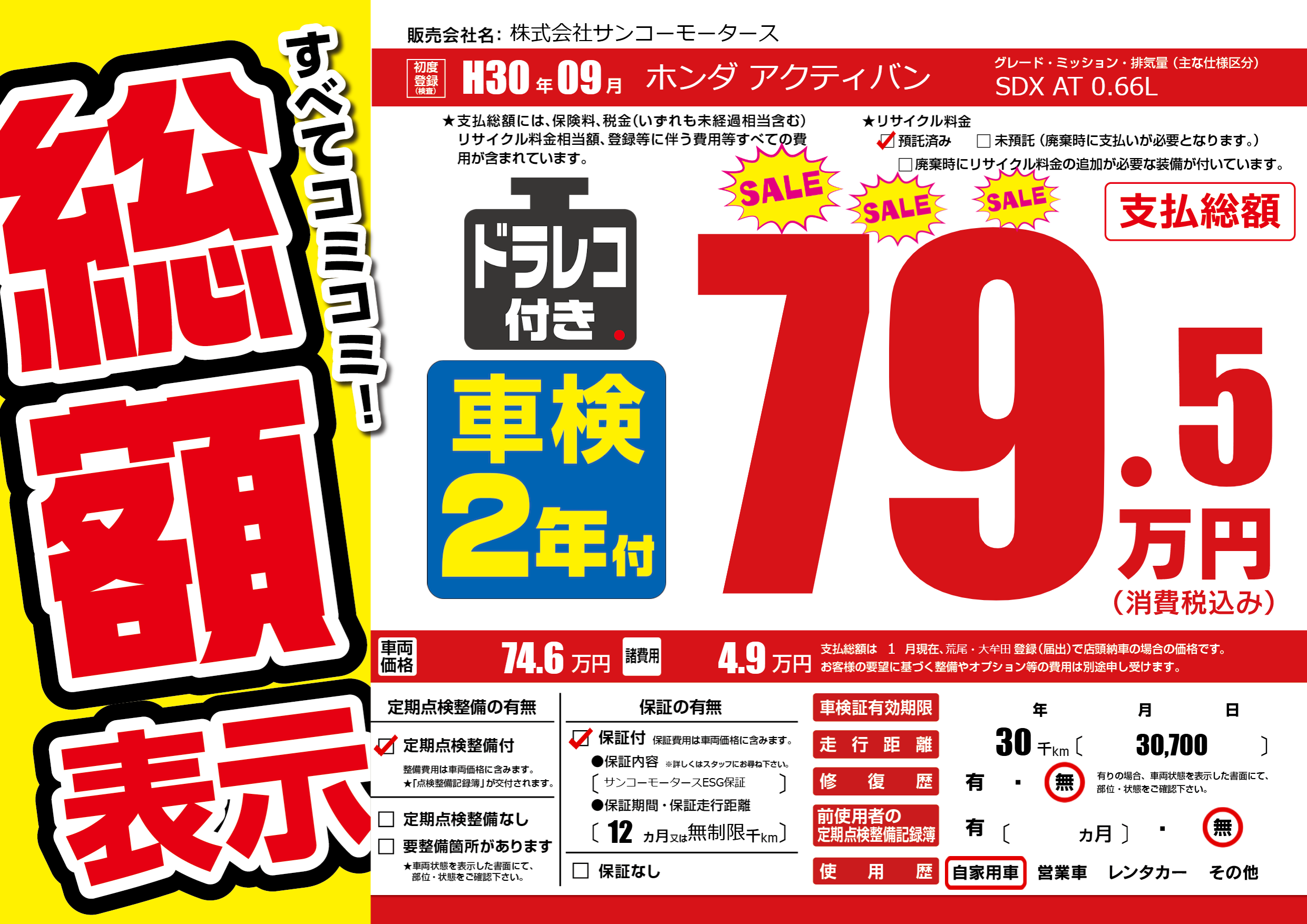 保証付き 保証内容(サンコーモータースESG保証) 12ヶ月または無制限千km |