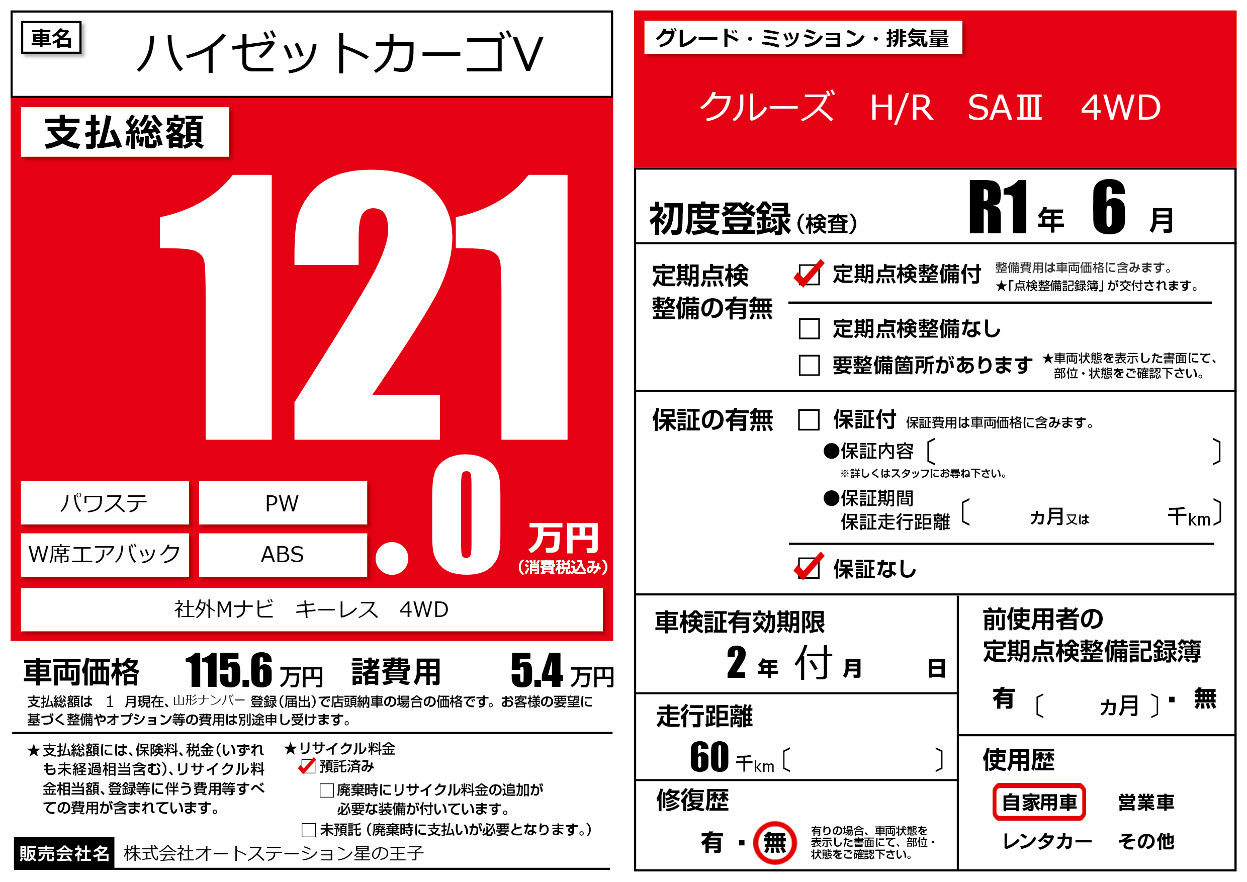 | 車名 | ハイゼットカーゴV | グレード ミッション 排気量 |