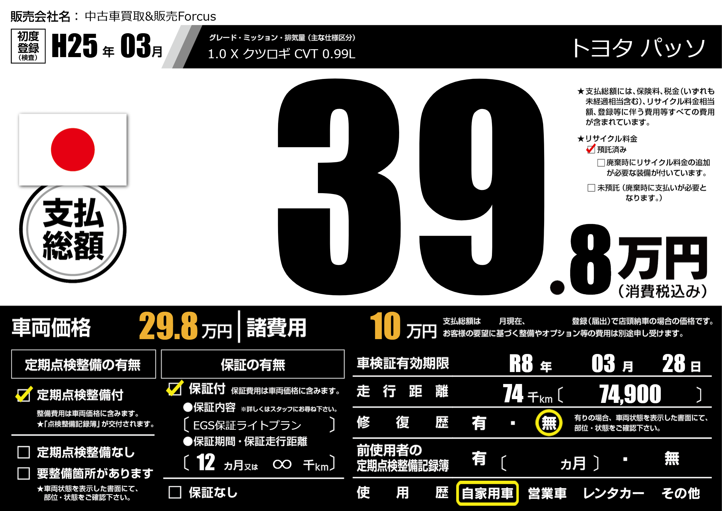 | 車名 | トヨタ パッソ | グレード ミッション 排気量 |