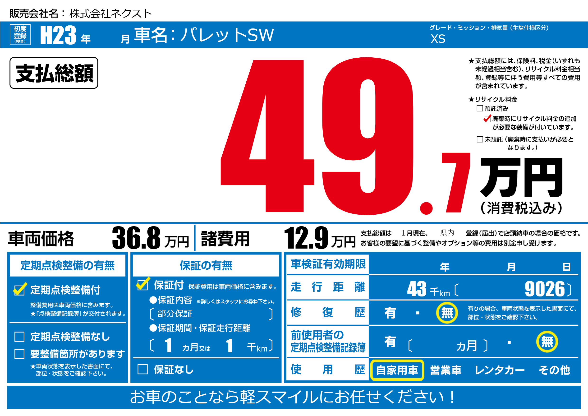 | 車名 | パレットSW | グレード ミッション 排気量 |