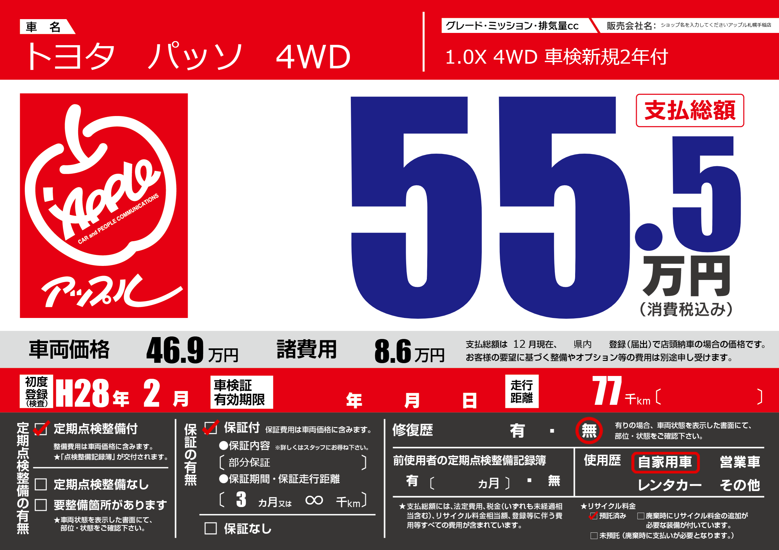 | 車名 | トヨタ パッソ 4WD | グレード ミッション 排気量 |
