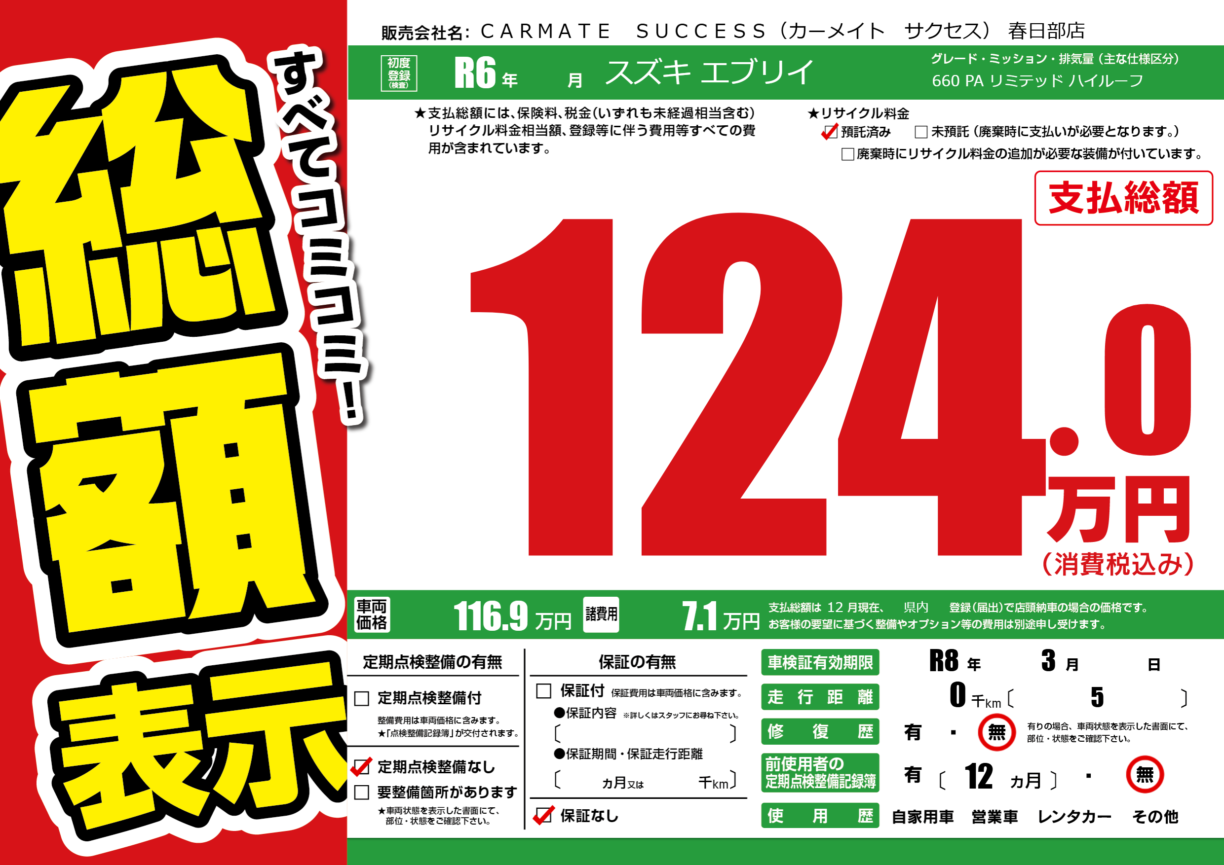 | 車名 | スズキ エブリイ | グレード ミッション 排気量 |