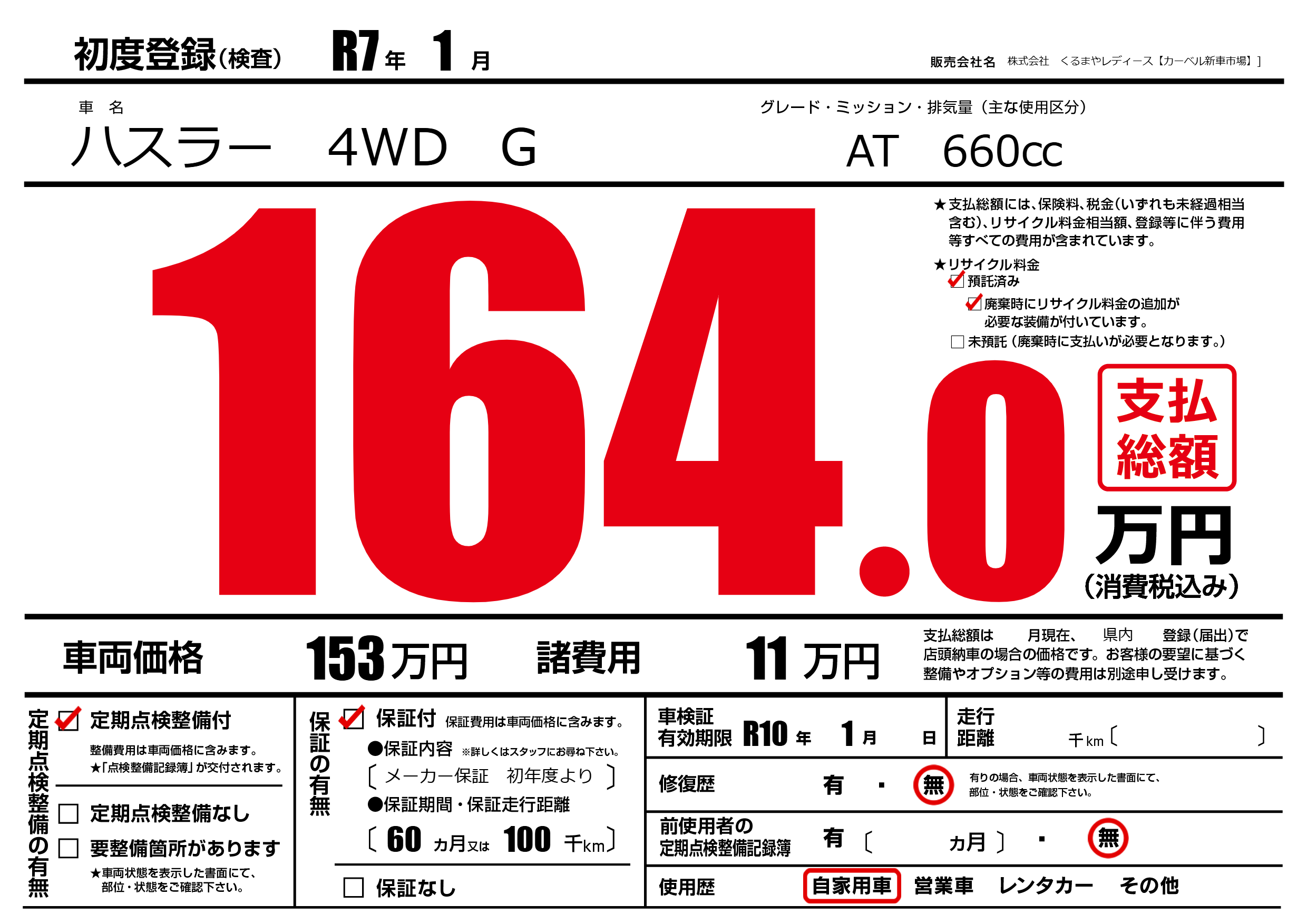 | 車名 | ハスラー 4WD G | グレード ミッション 排気量 |