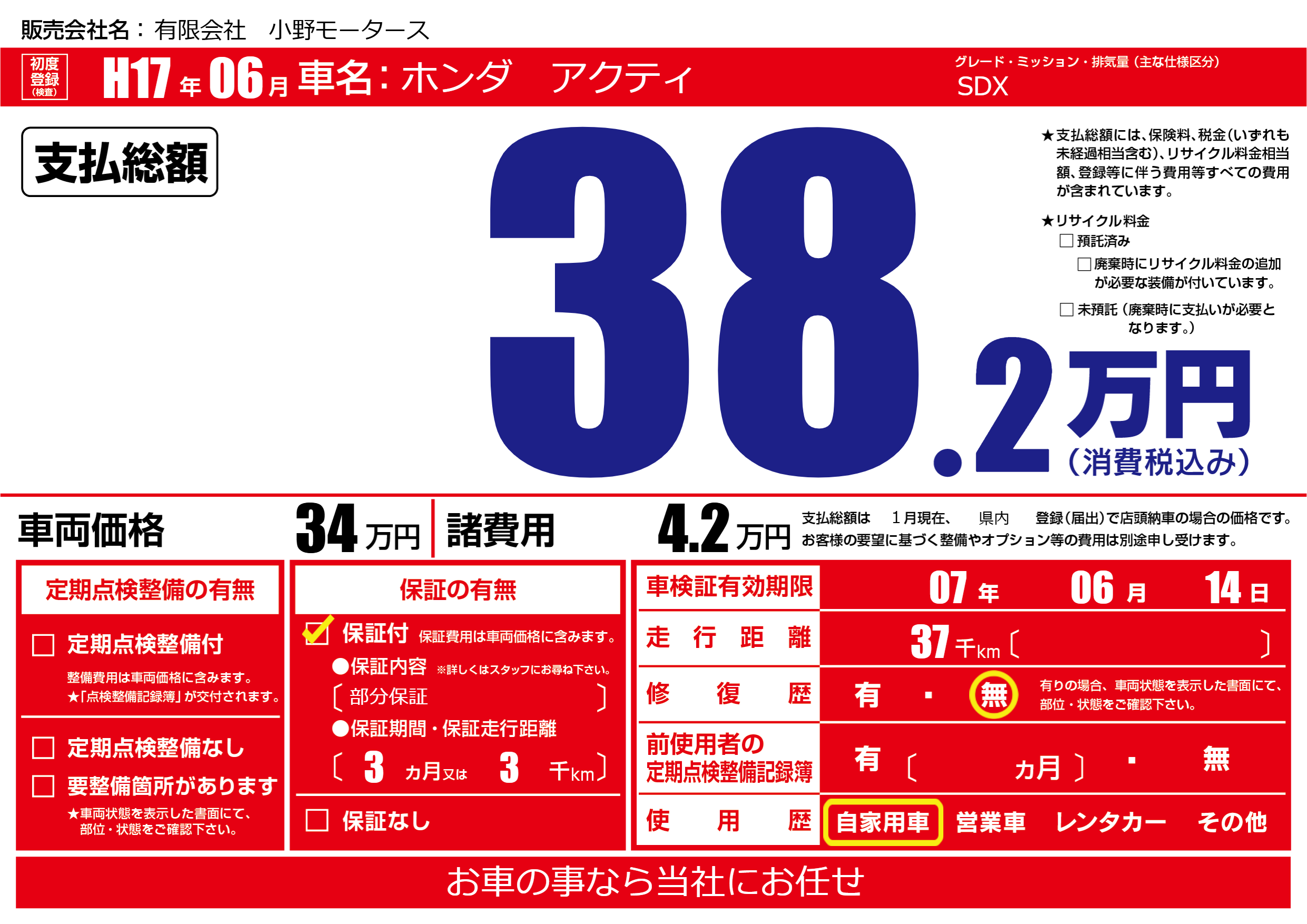 | 走行キロ | 3.7万km | 初年度登録 | H17年06月 |