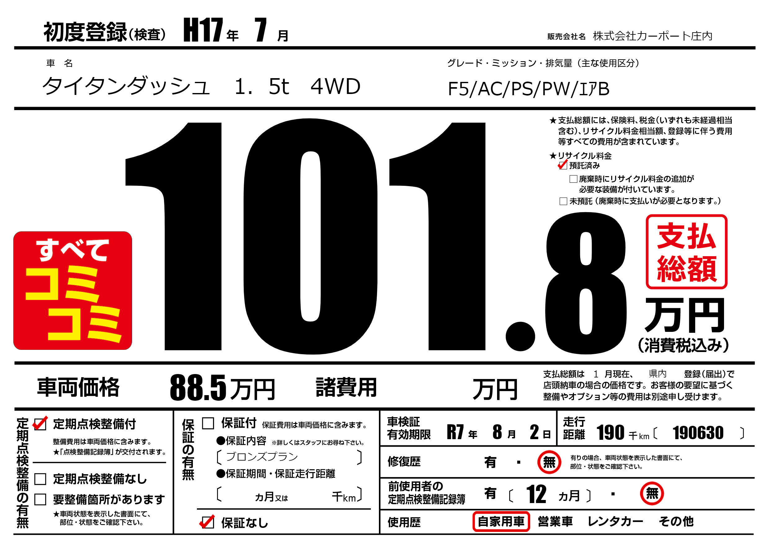 | 走行キロ | 19万km | 初年度登録 | H17年7月 |