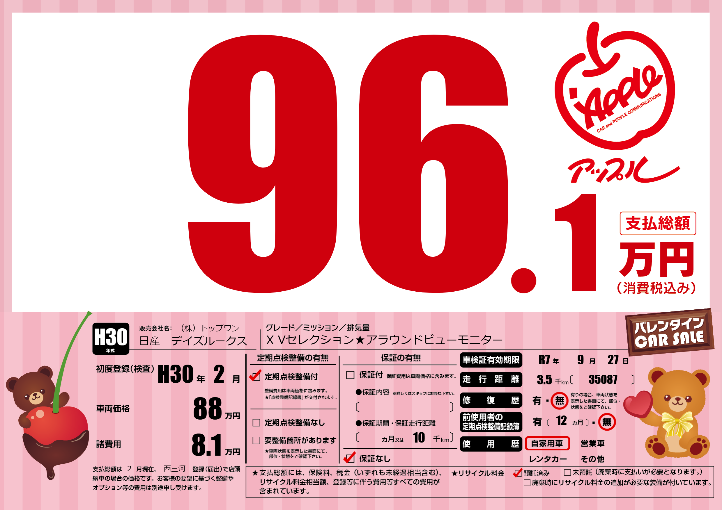 | 走行キロ | 0.3万km | 初年度登録 | H30年2月 |