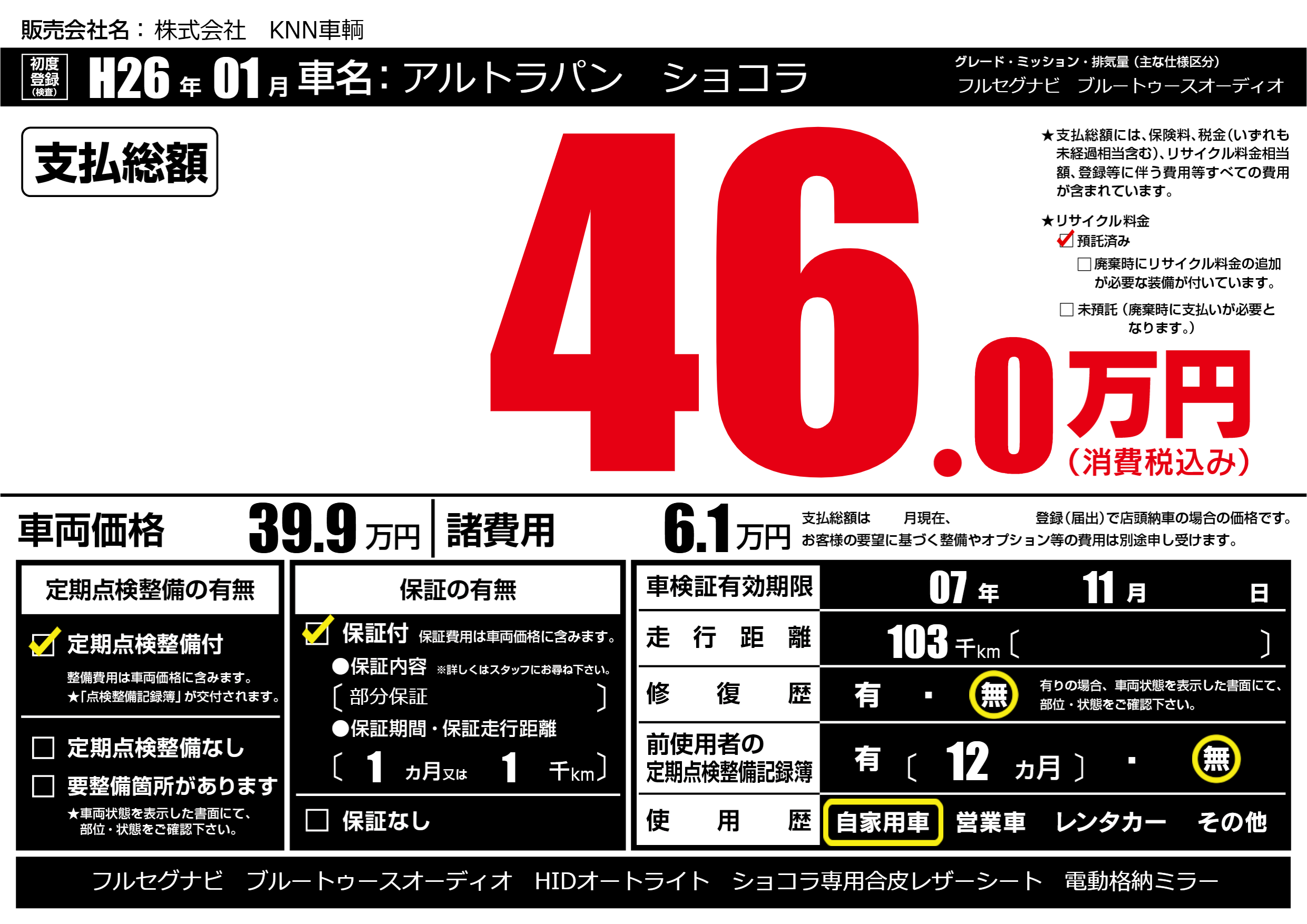 | 走行キロ | 10.3万km | 初年度登録 | H26年01月 |