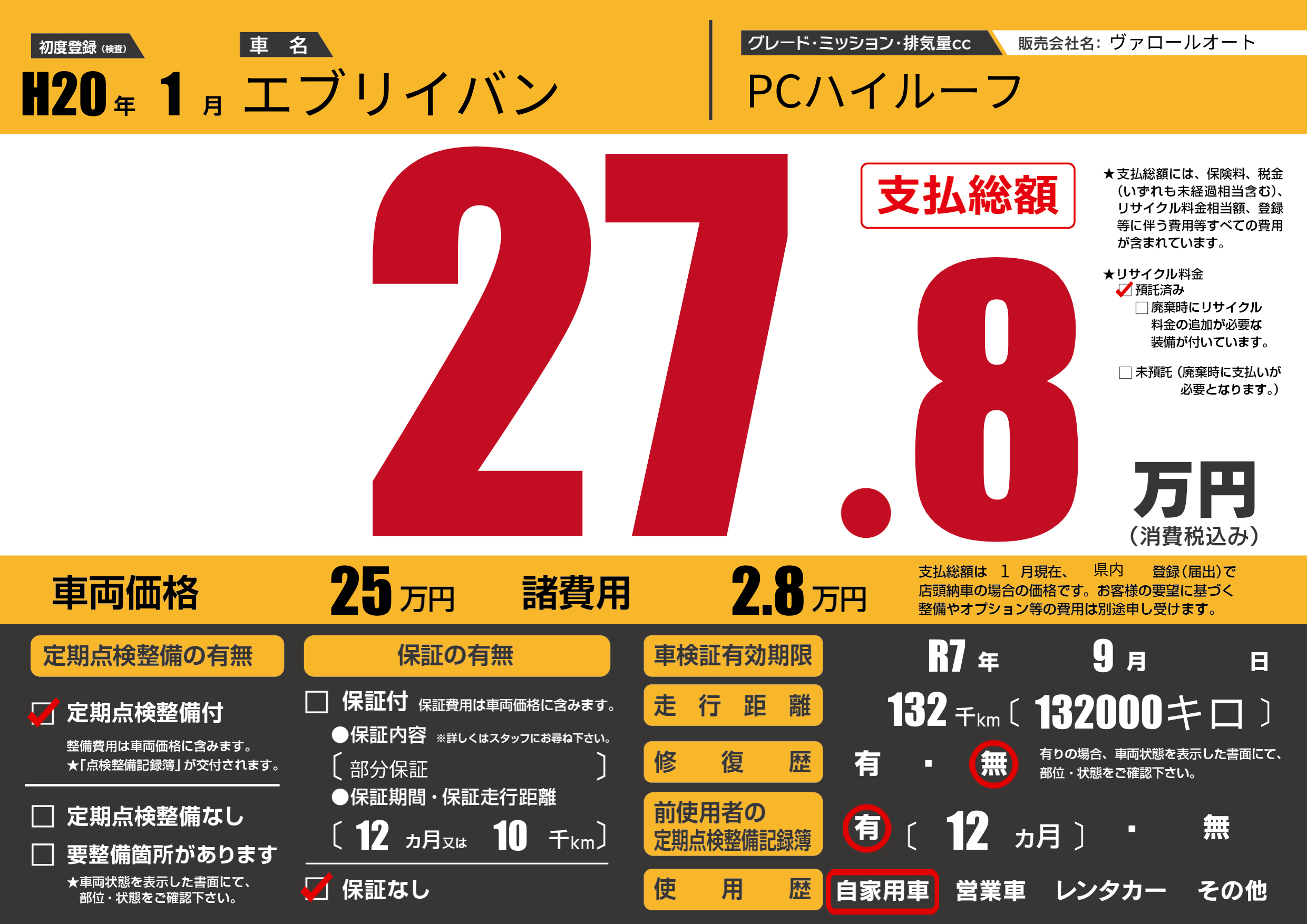 | 車検制限 | R7年 9月 - 日 | ||