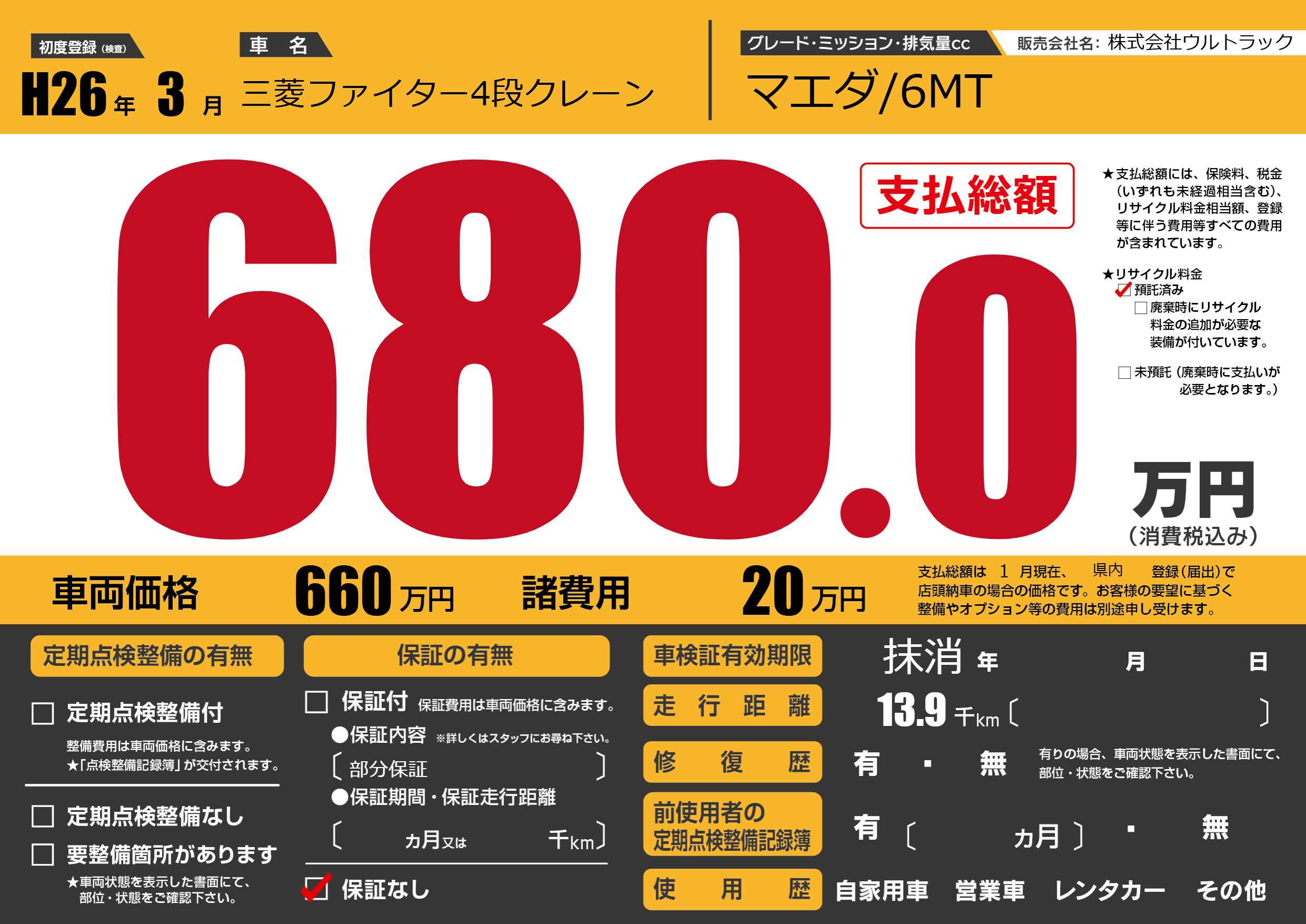 | 車名 | 三菱ファイター4段クレーン | グレード ミッション 排気量 |
