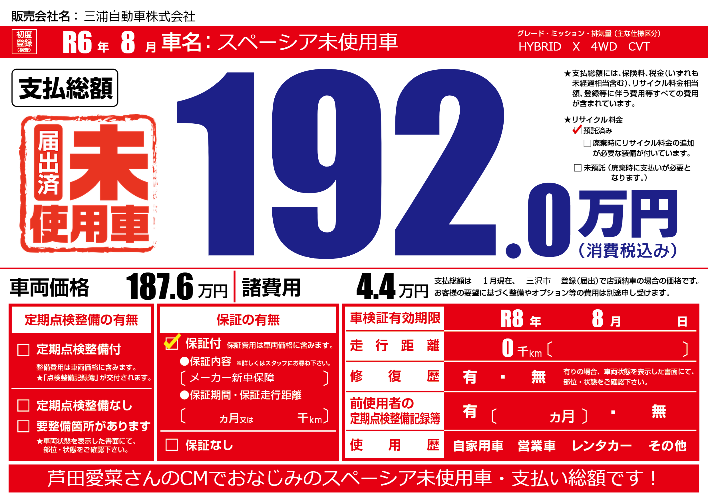 | 車名 | スペーシア未使用車 | グレード ミッション 排気量 |