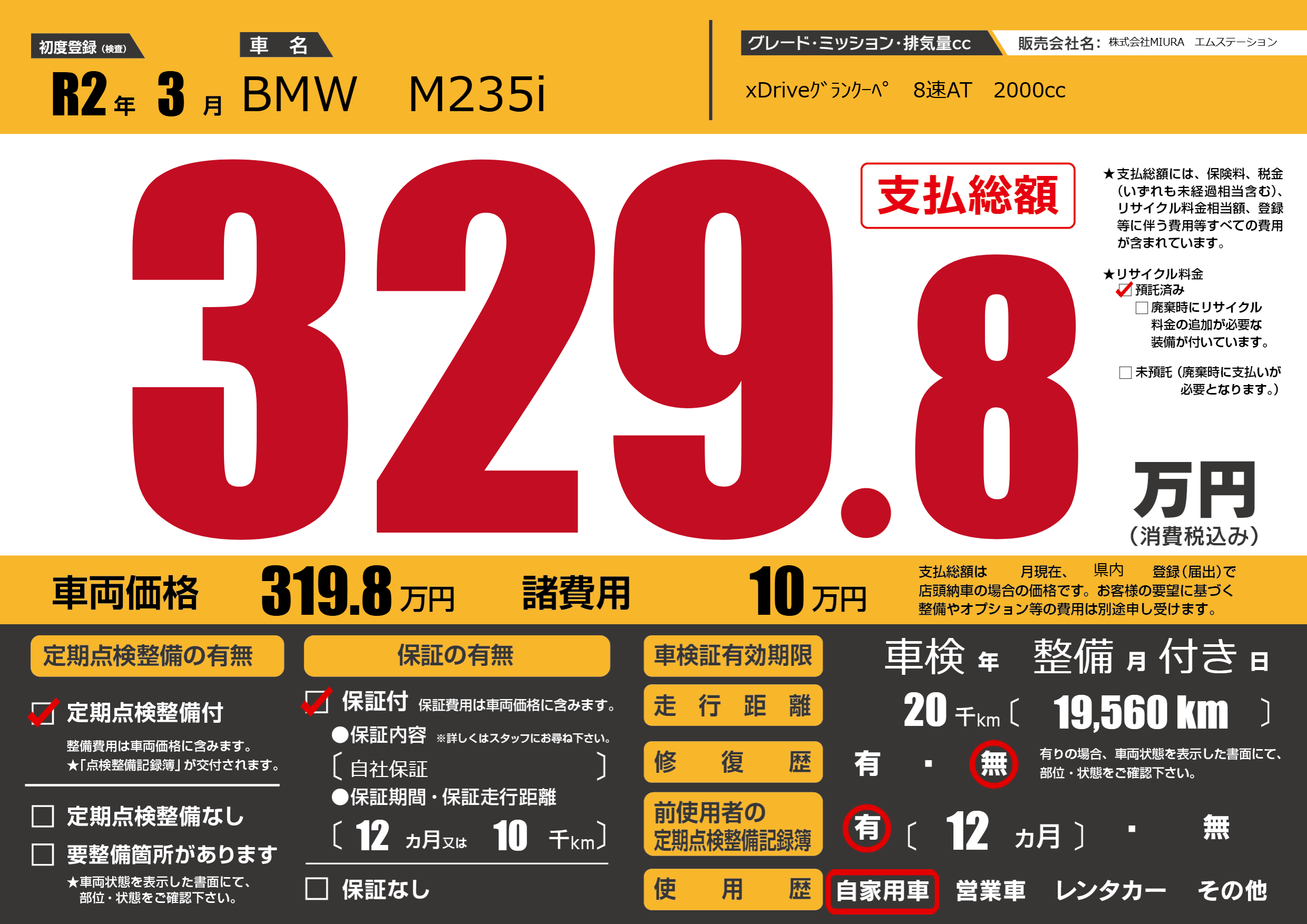 | 車名 | BMW M235i | グレード ミッション 排気量 |