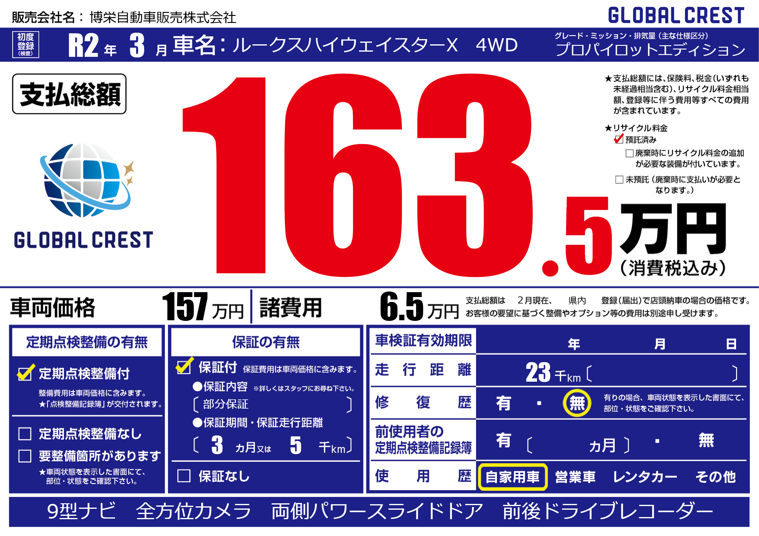| 走行キロ | 2.3万km | 初年度登録 | R2年3月 |