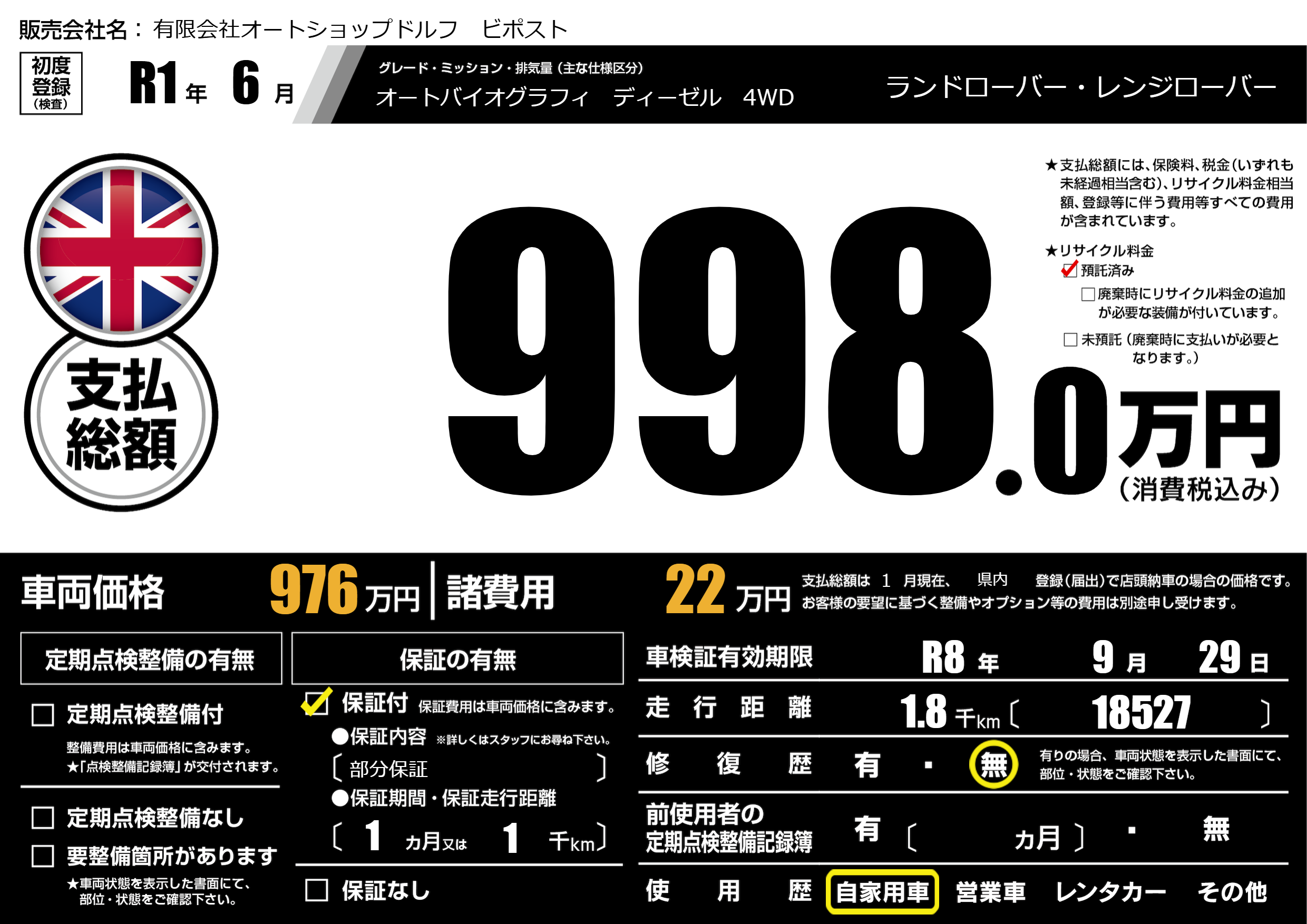 | 車検制限 | R8年 9月 29日 | ||