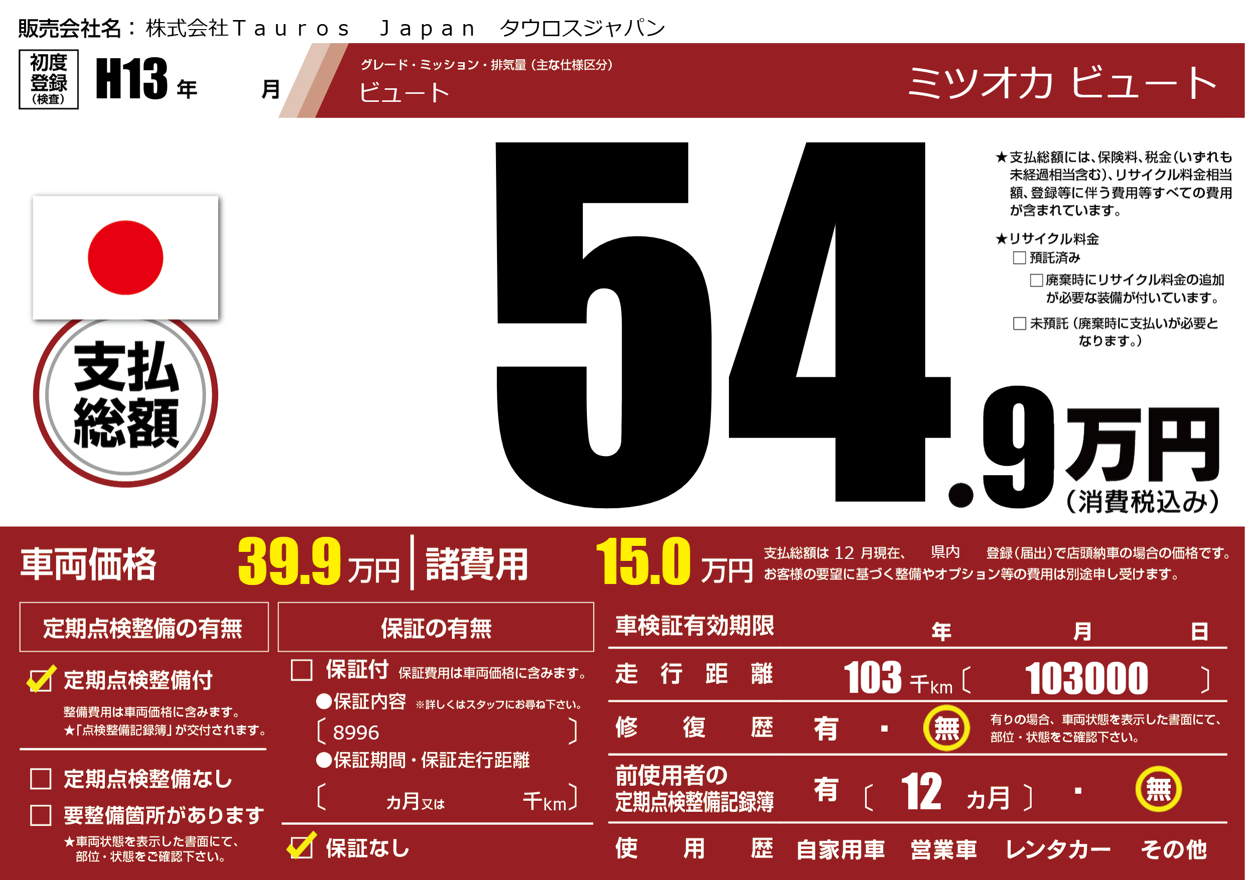 | 車名 | ミツオカ ビュート | グレード ミッション 排気量 |