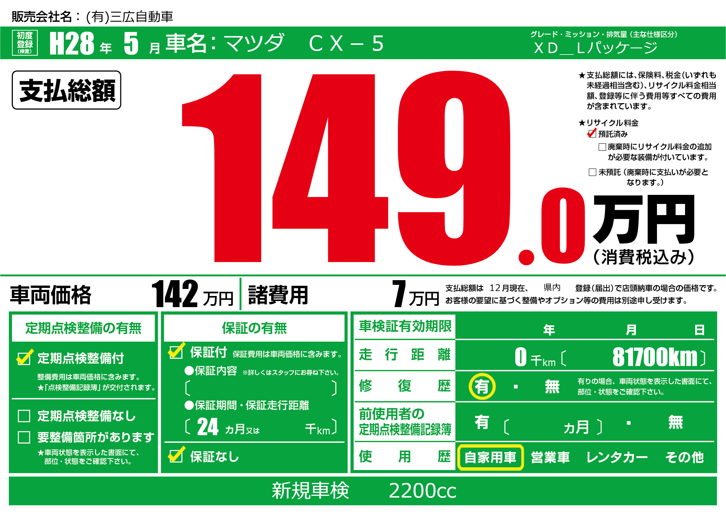 | 車名 | マツダ CX-5 | グレード ミッション 排気量 |