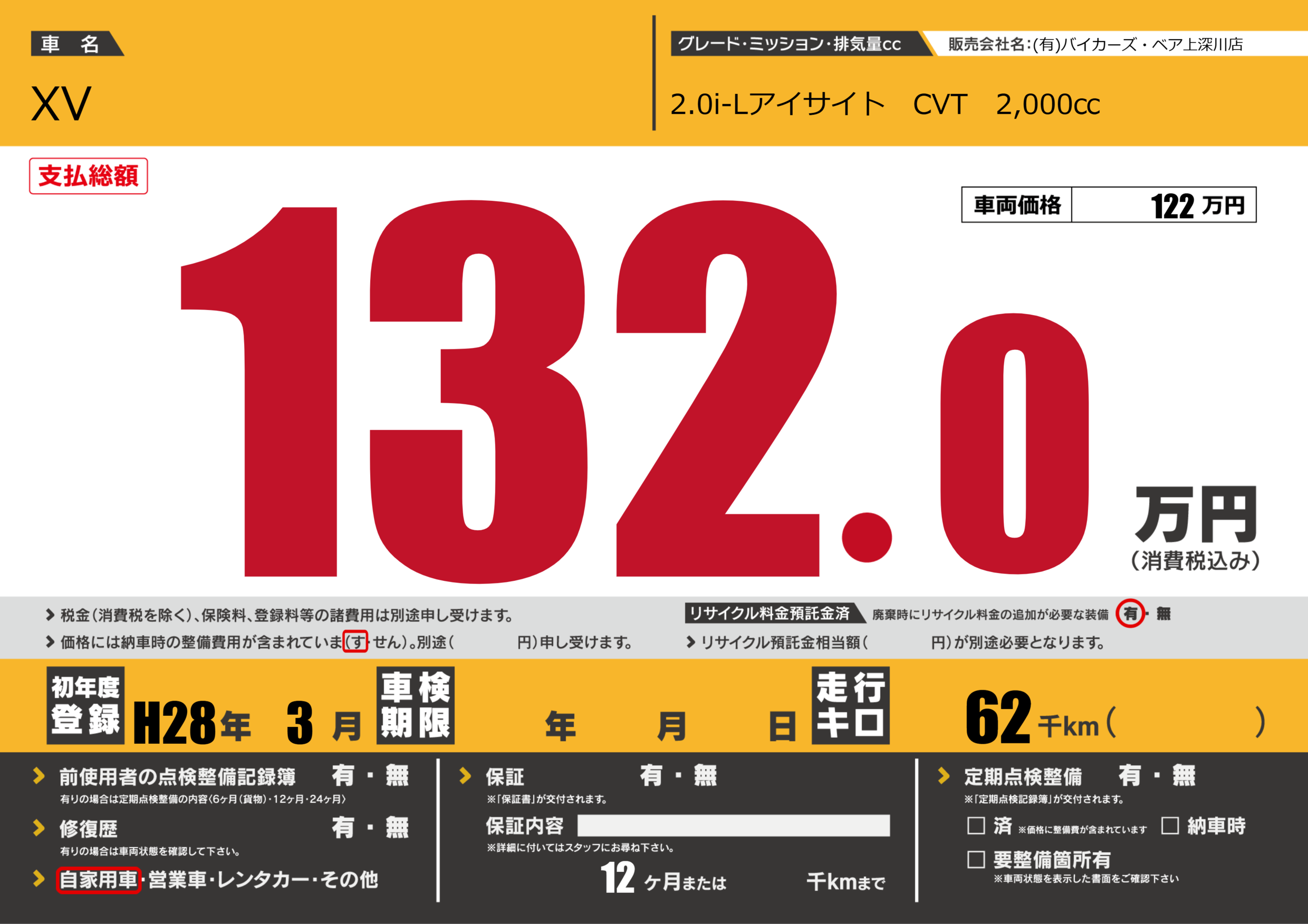 保証なし 保証内容(---) 12ヶ月または()千kmまで |