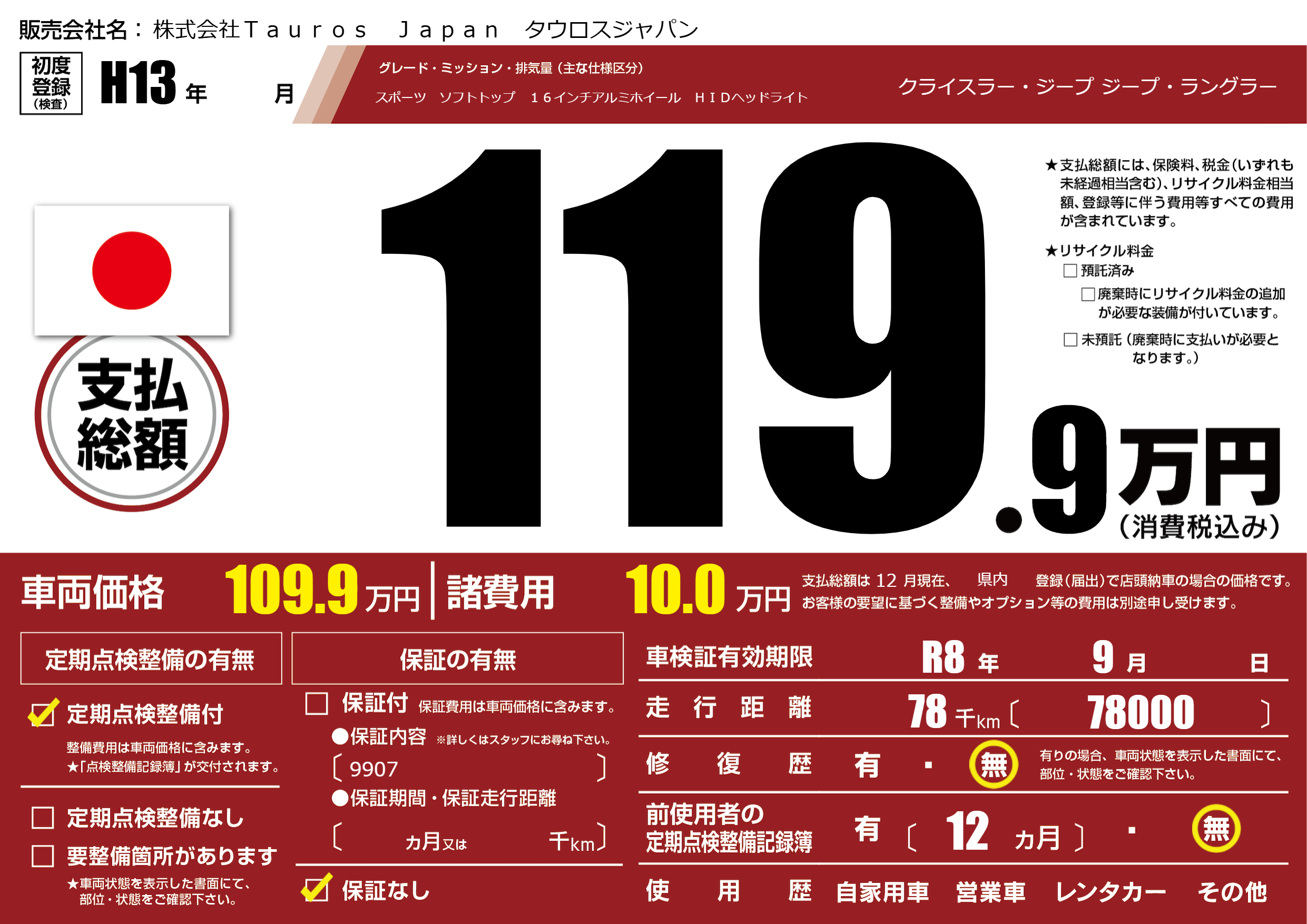 | 車名 | クライスラー・ジープ ジープ・ラングラー | グレード ミッション 排気量 |