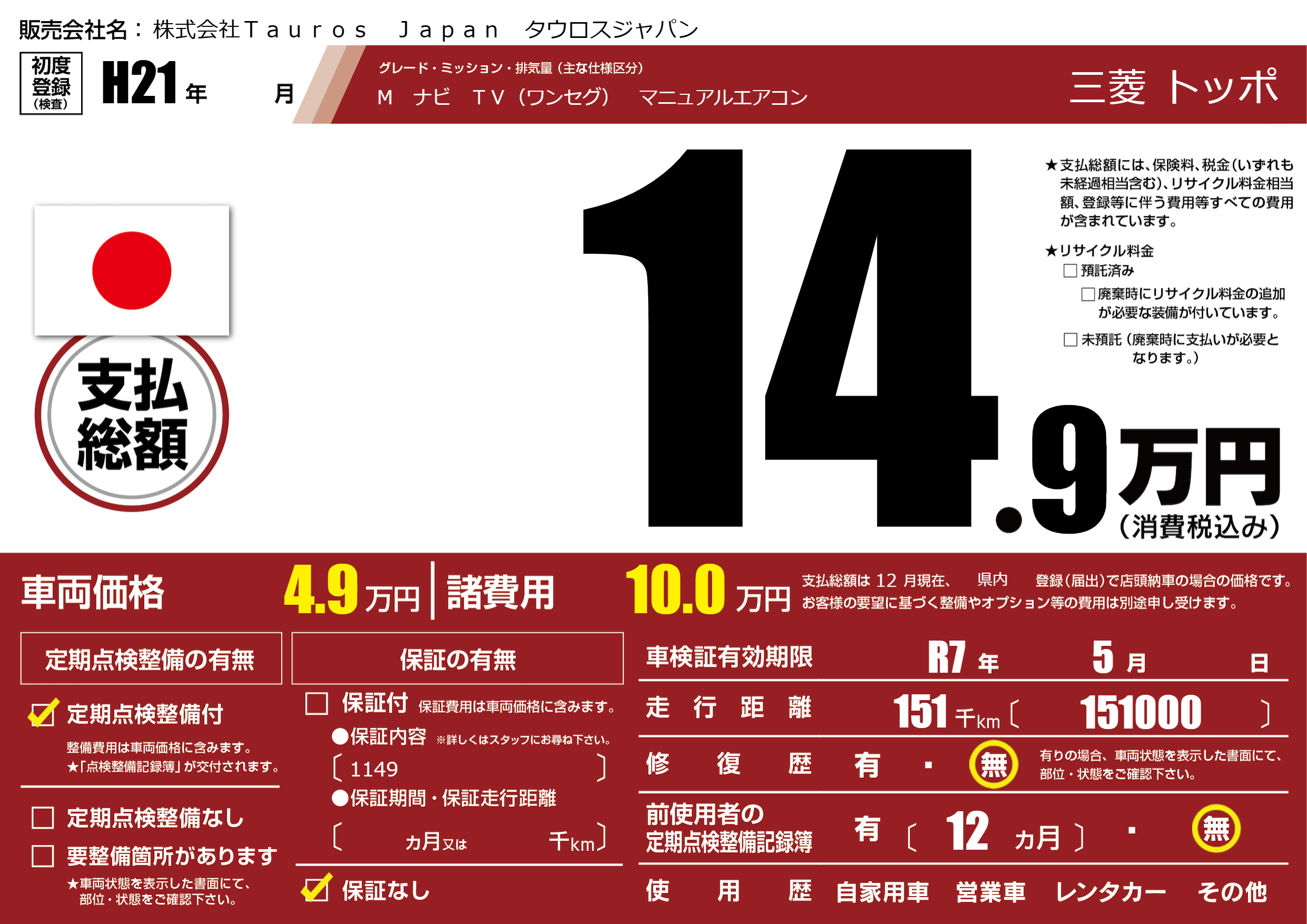 | 走行キロ | 15.1万km | 初年度登録 | H21年---月 |