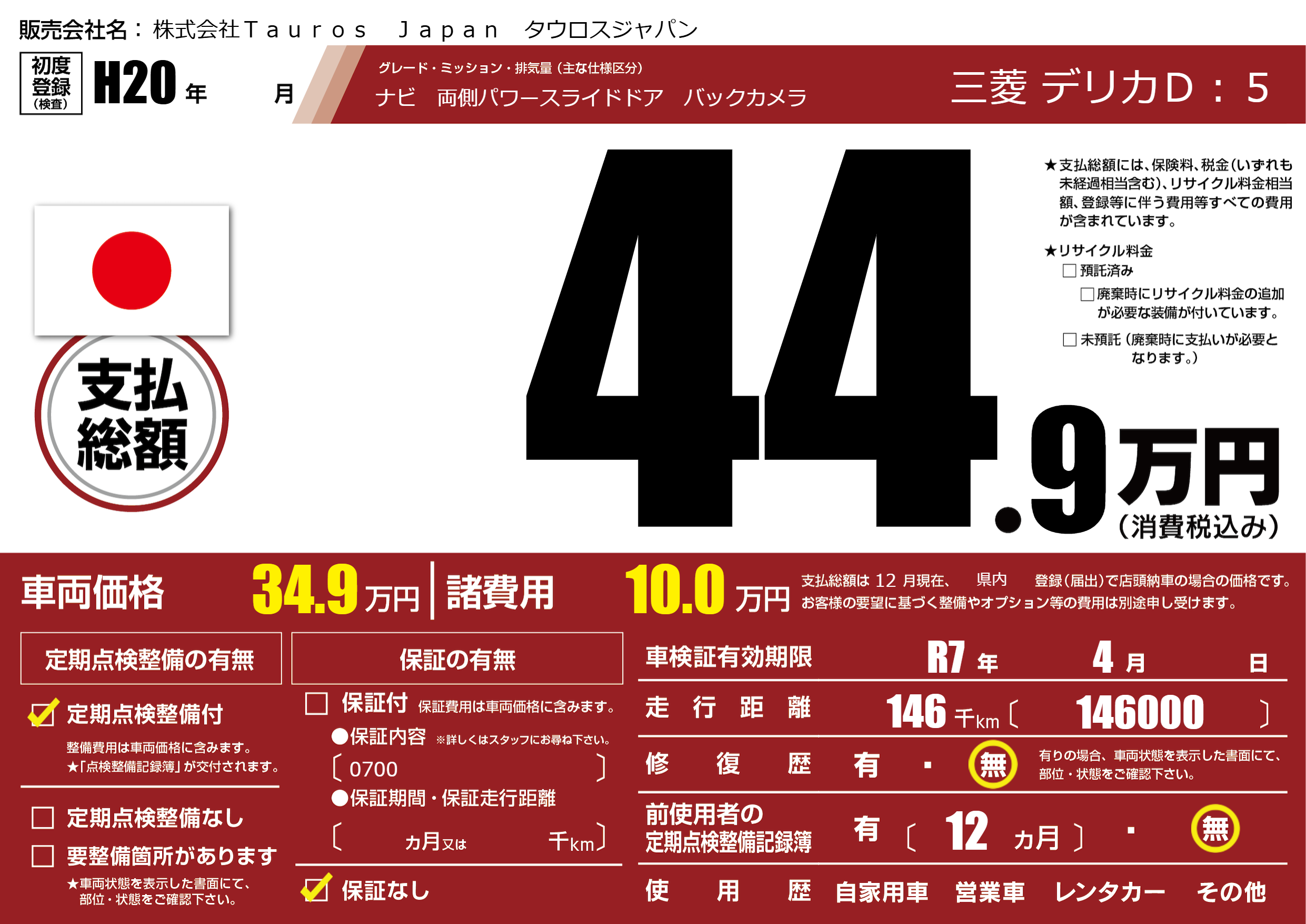 | 車名 | 三菱 デリカD:5 | グレード ミッション 排気量 |