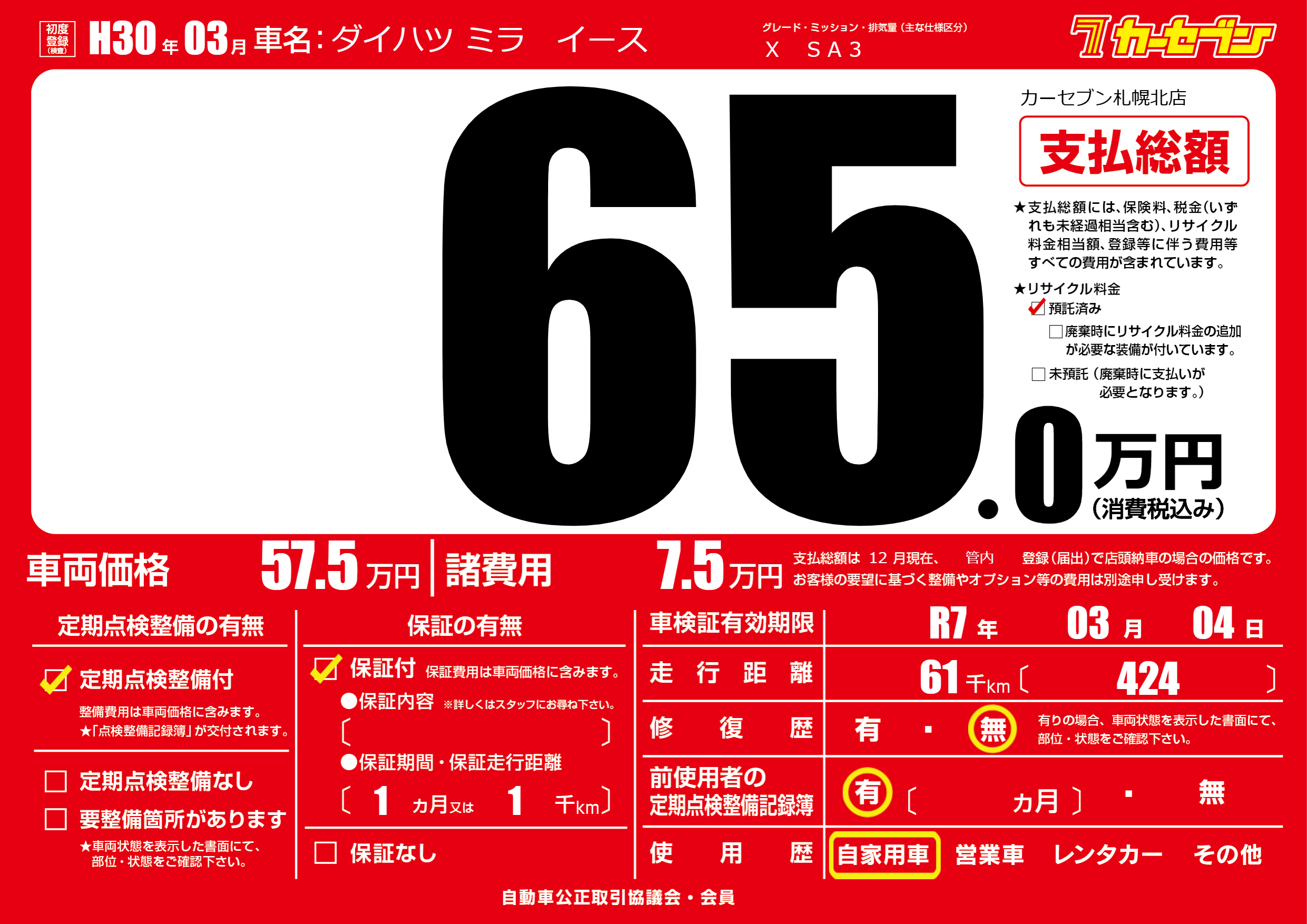 | 車名 | ダイハツ ミラ イース | グレード ミッション 排気量 |