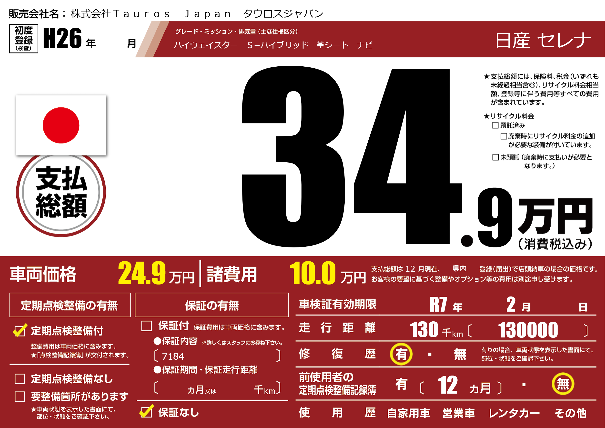 | 車検制限 | R7年 2月 - 日 | ||