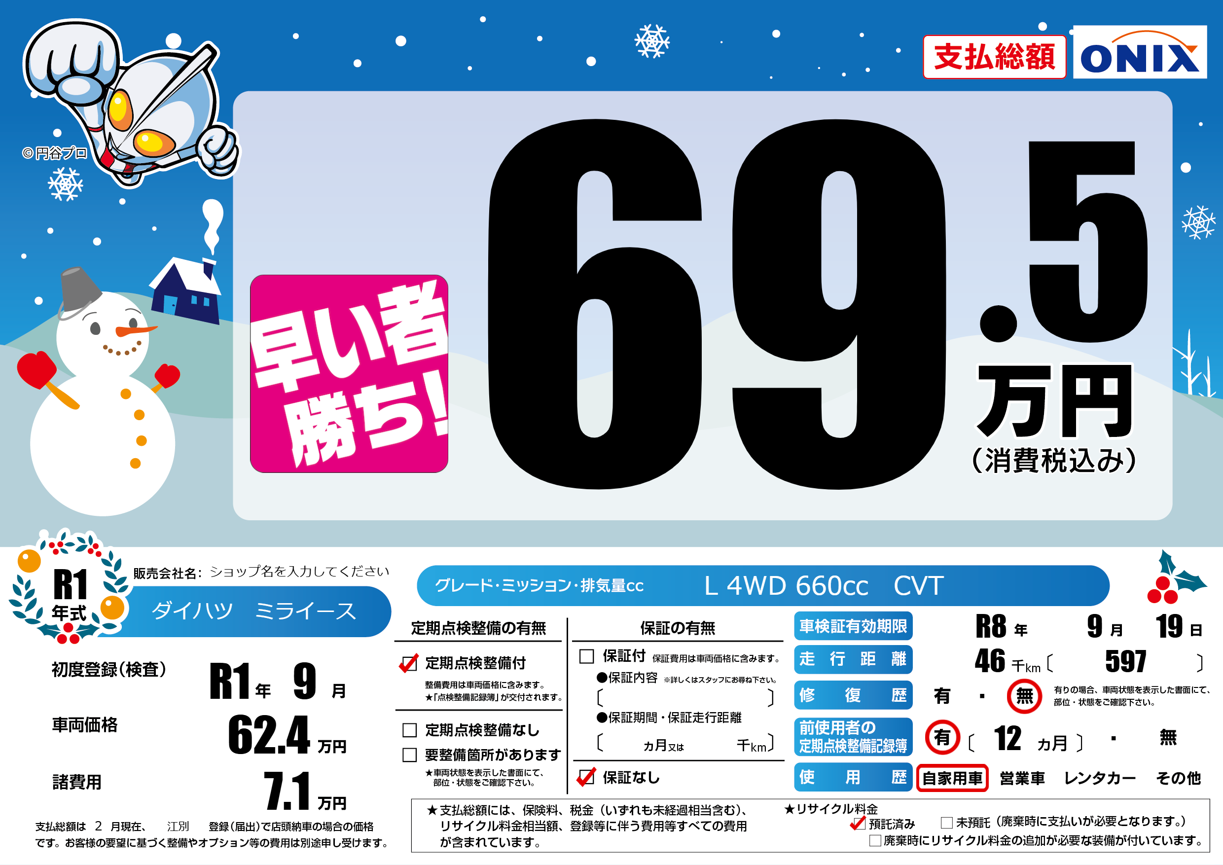 | 車名 | ダイハツ ミライース | グレード ミッション 排気量 |