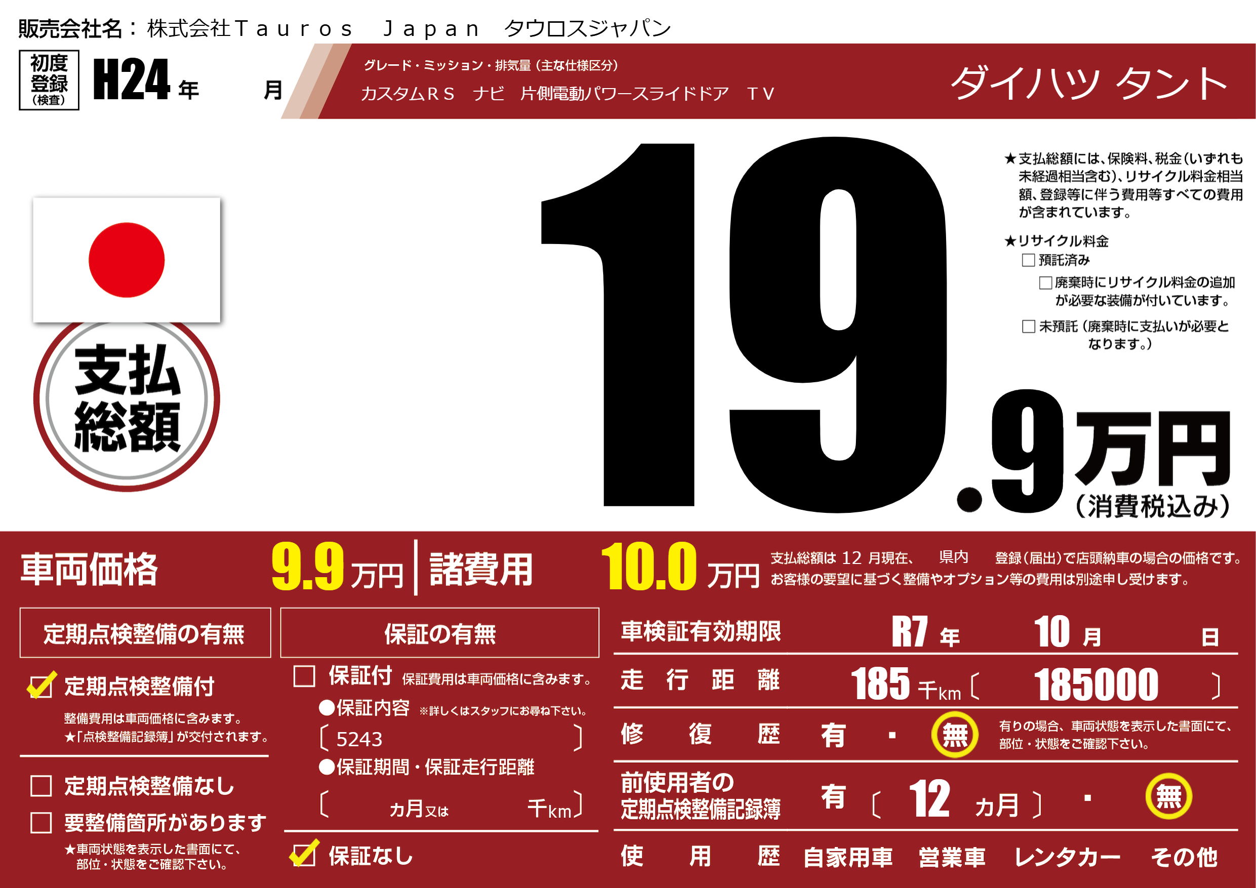 | 車名 | ダイハツ タント | グレード ミッション 排気量 |