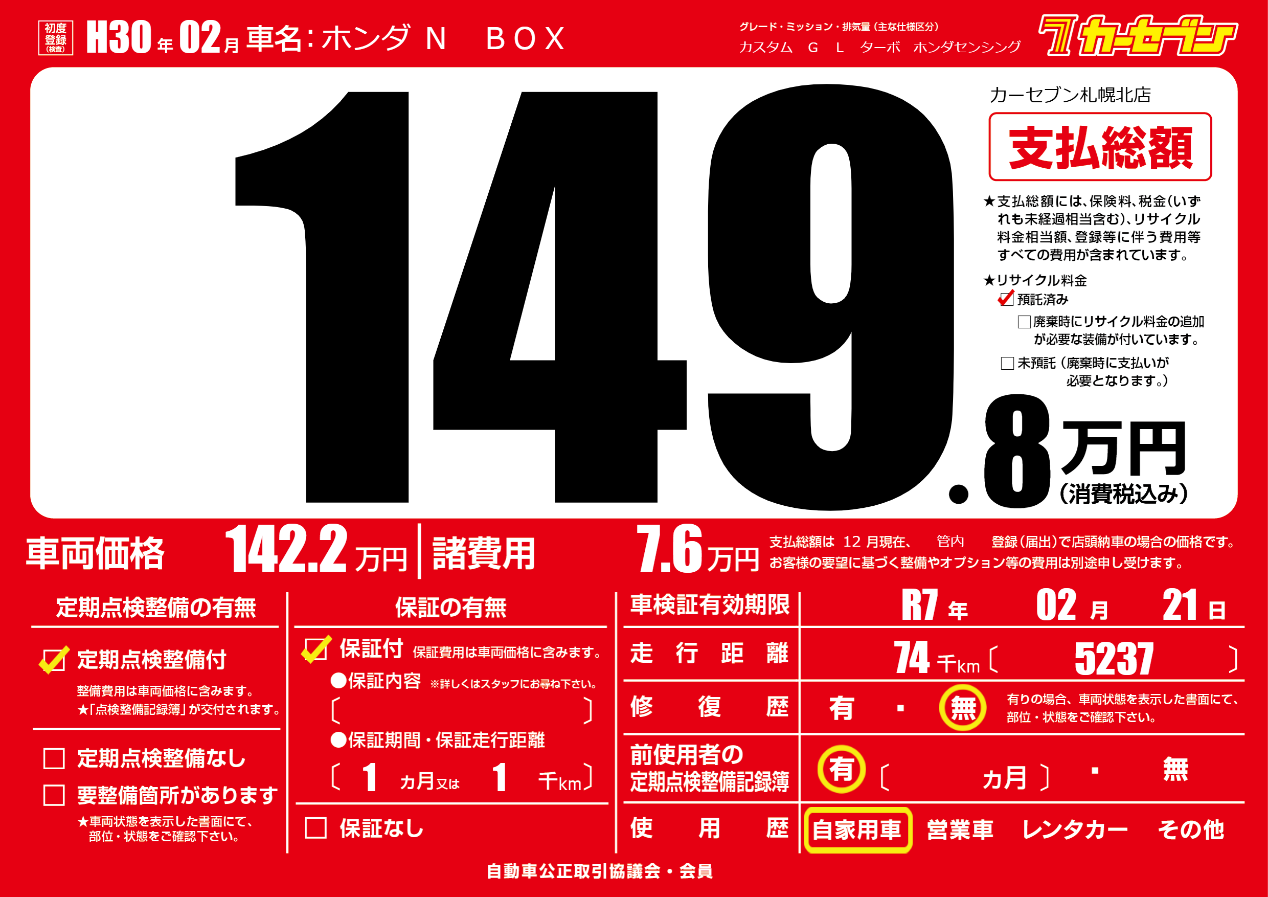| 走行キロ | 7.4万km | 初年度登録 | H30年02月 |