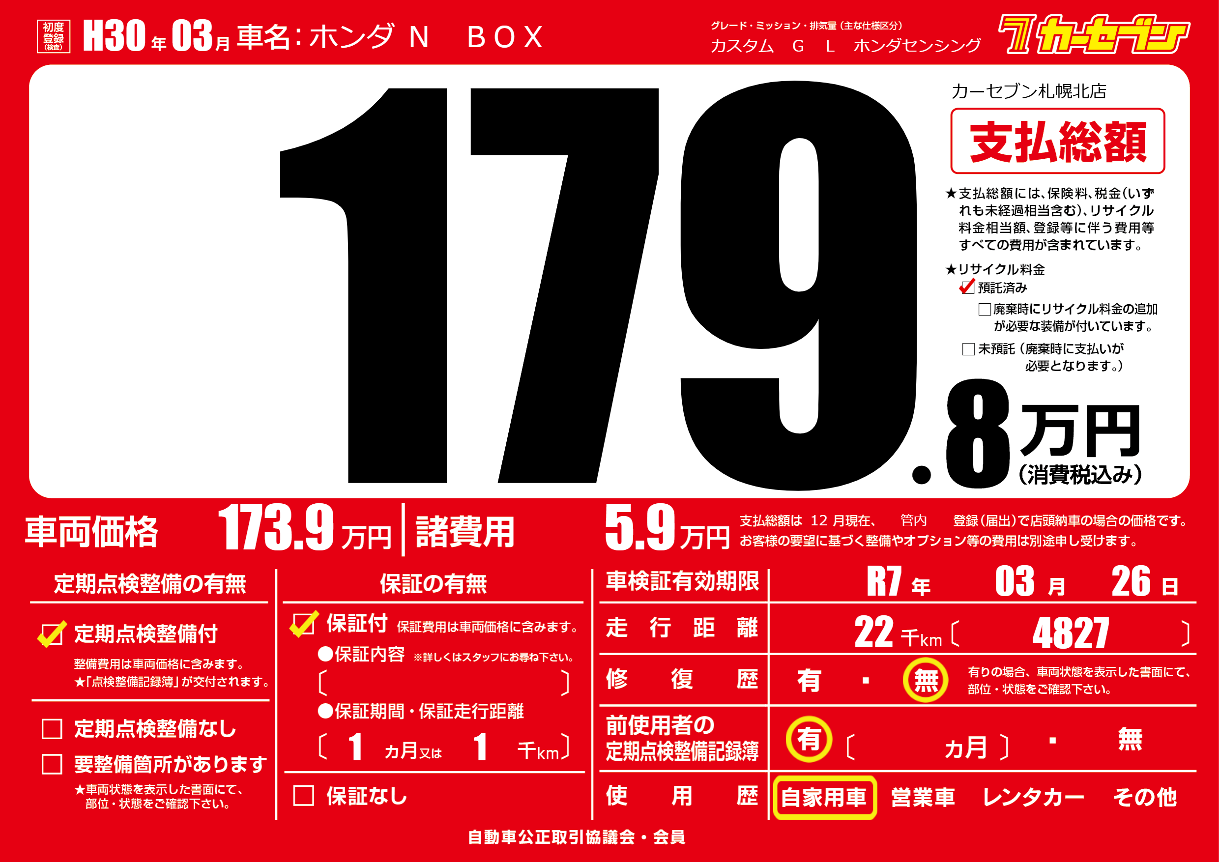 | 車名 | ホンダ N BOX | グレード ミッション 排気量 |