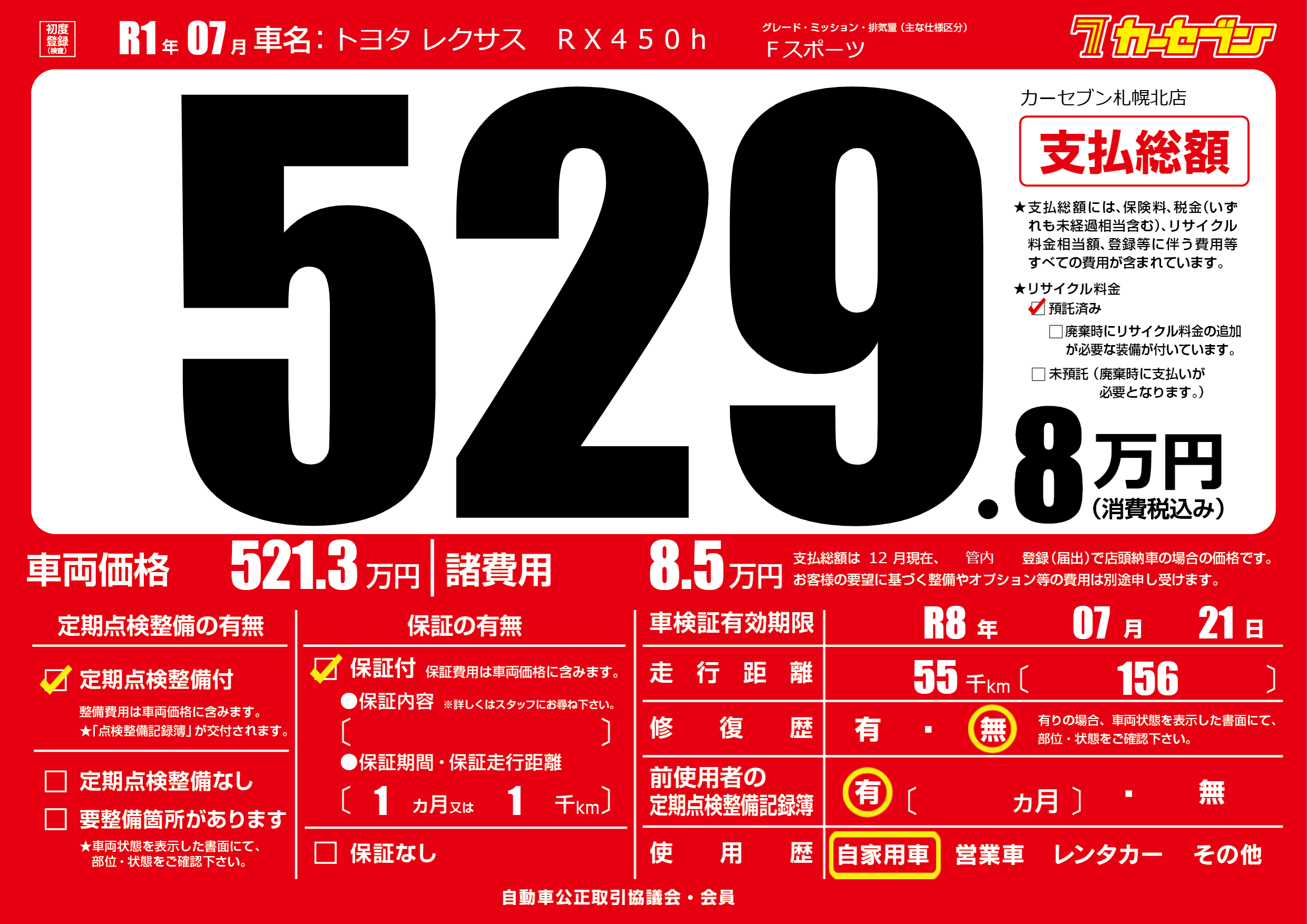 | 車名 | トヨタ レクサス RX450h | グレード ミッション 排気量 |