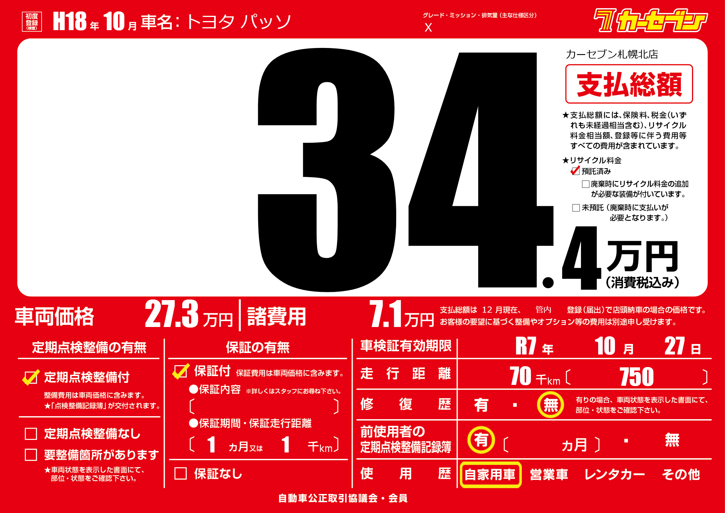 | 走行キロ | 7万km | 初年度登録 | H18年10月 |