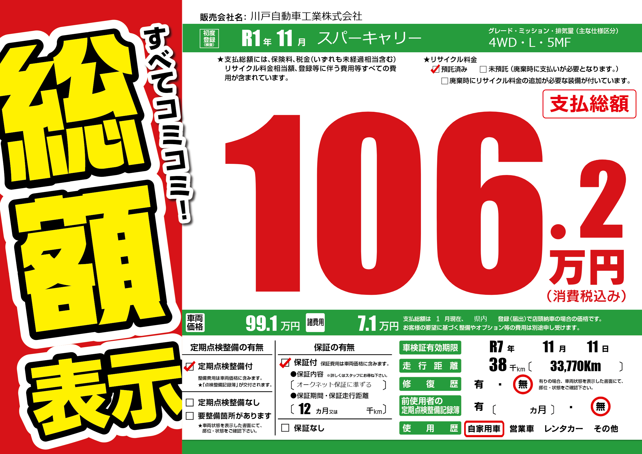 | 車名 | スパーキャリー | グレード ミッション 排気量 |