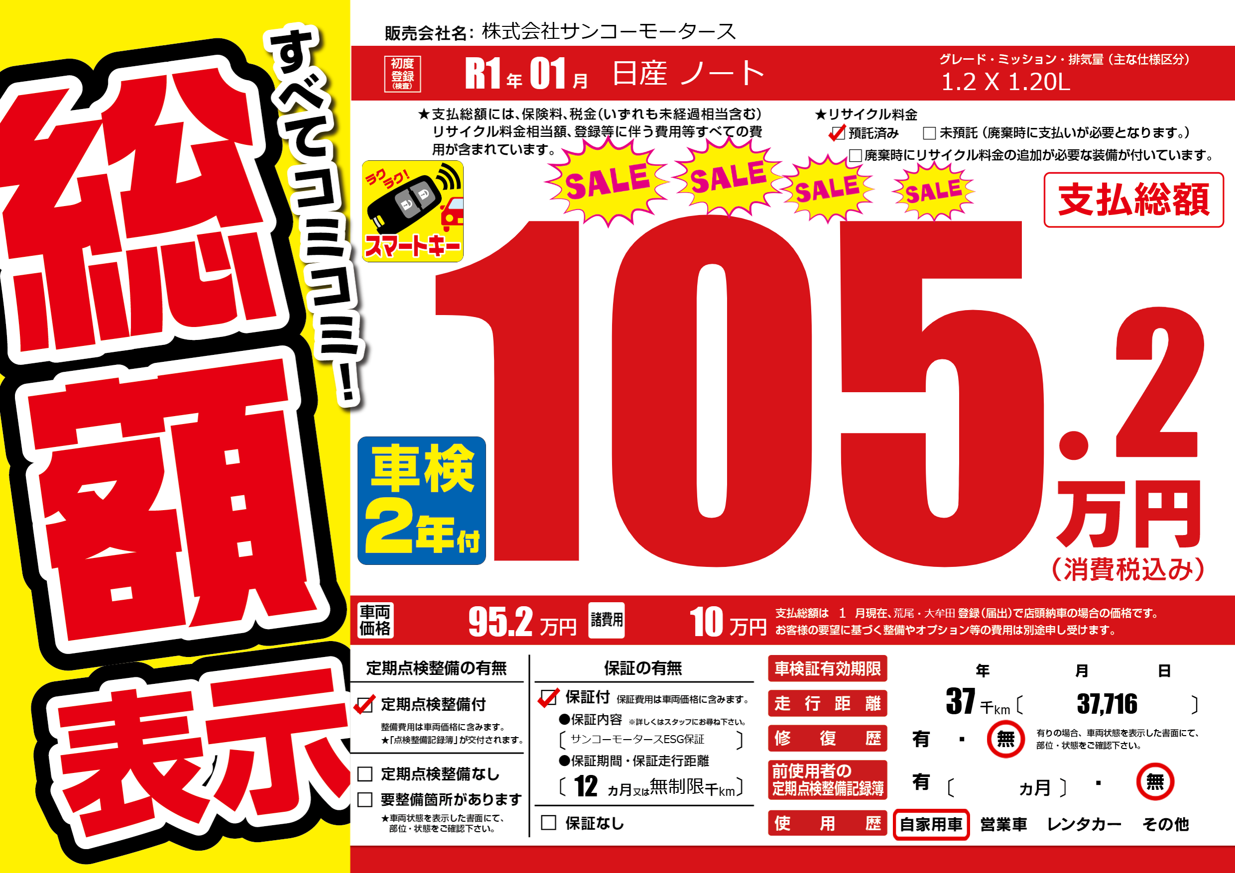 保証付き 保証内容(サンコーモータースESG保証) 12ヶ月または無制限千km |