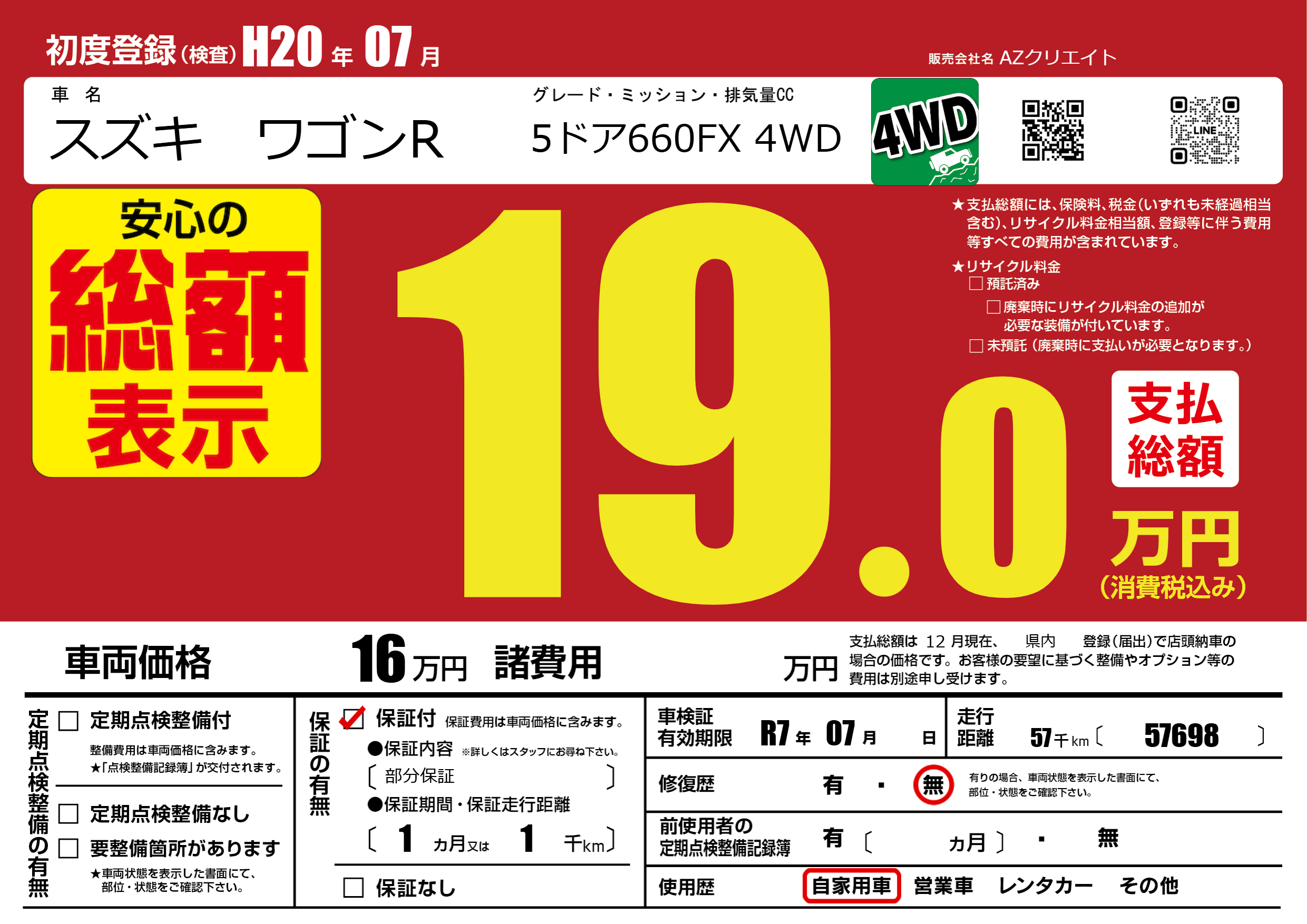 | 車名 | スズキ ワゴンR | グレード ミッション 排気量 |