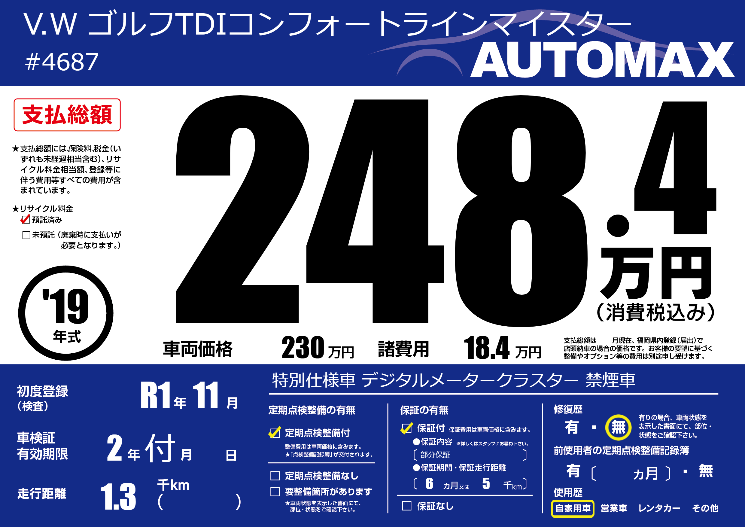 | 車名 | V.W ゴルフTDIコンフォートラインマイスター | グレード ミッション 排気量 |