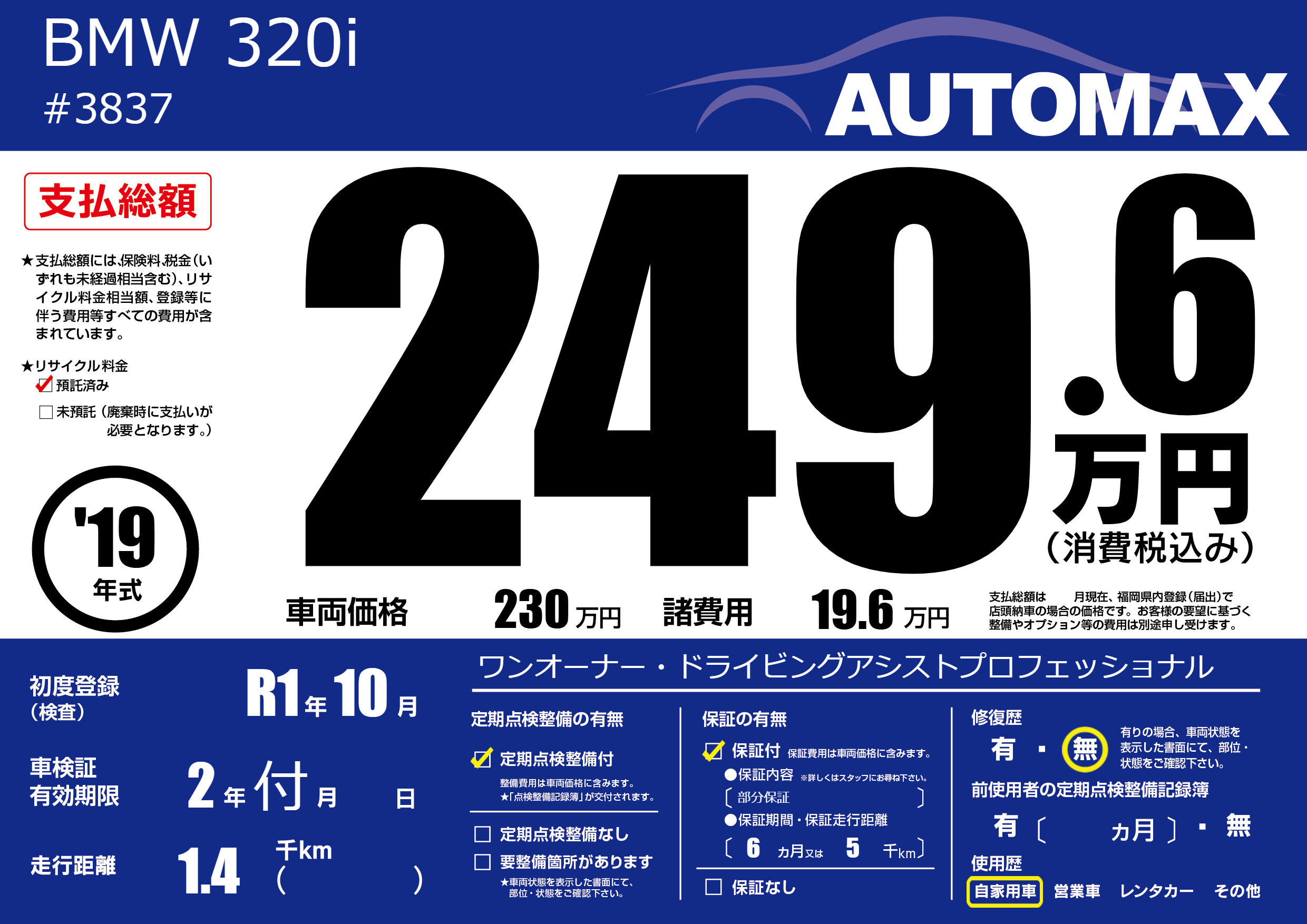 | 車名 | BMW 320i | グレード ミッション 排気量 |