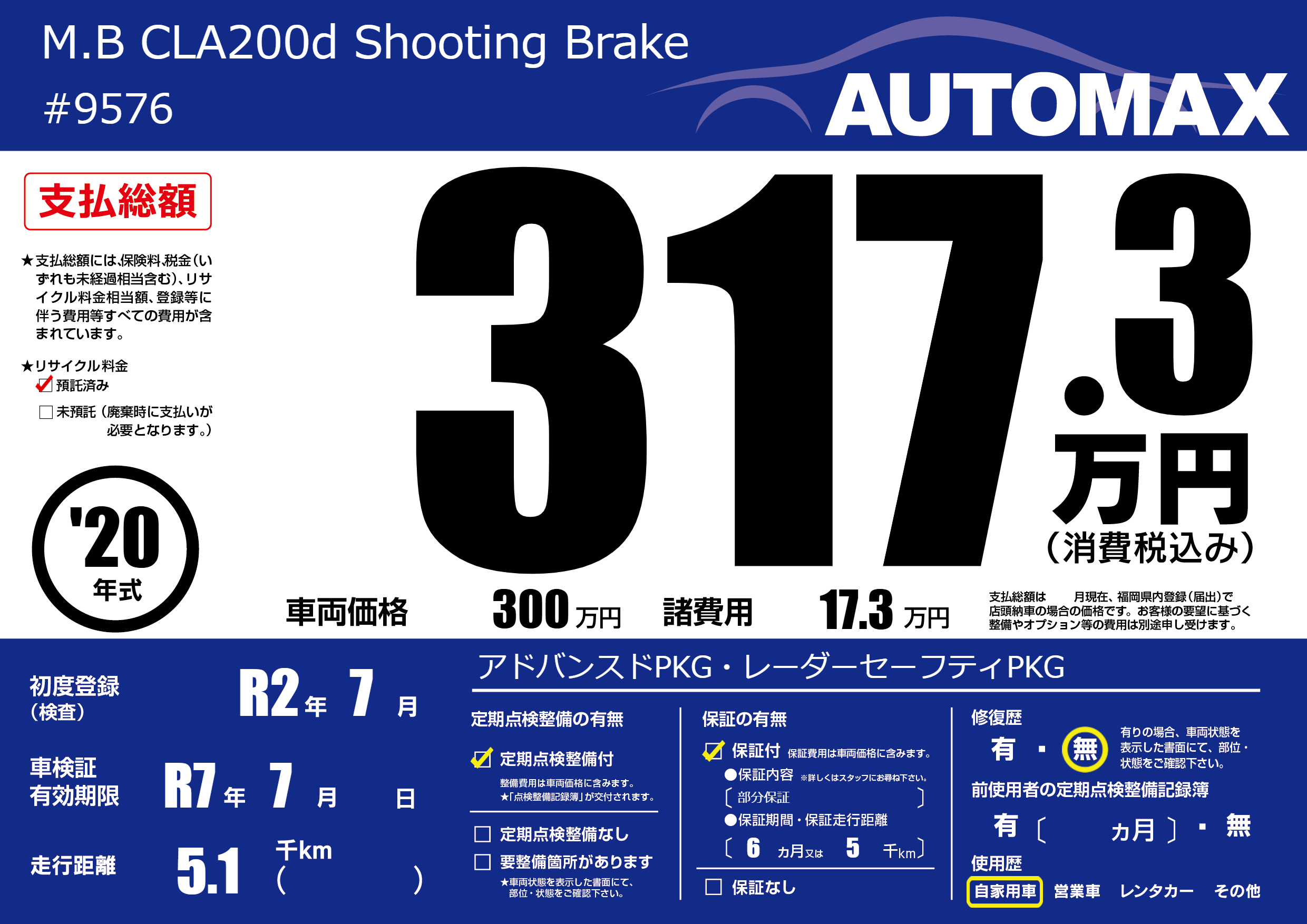 | 車名 | M.B CLA200d Shooting Brake | グレード ミッション 排気量 |