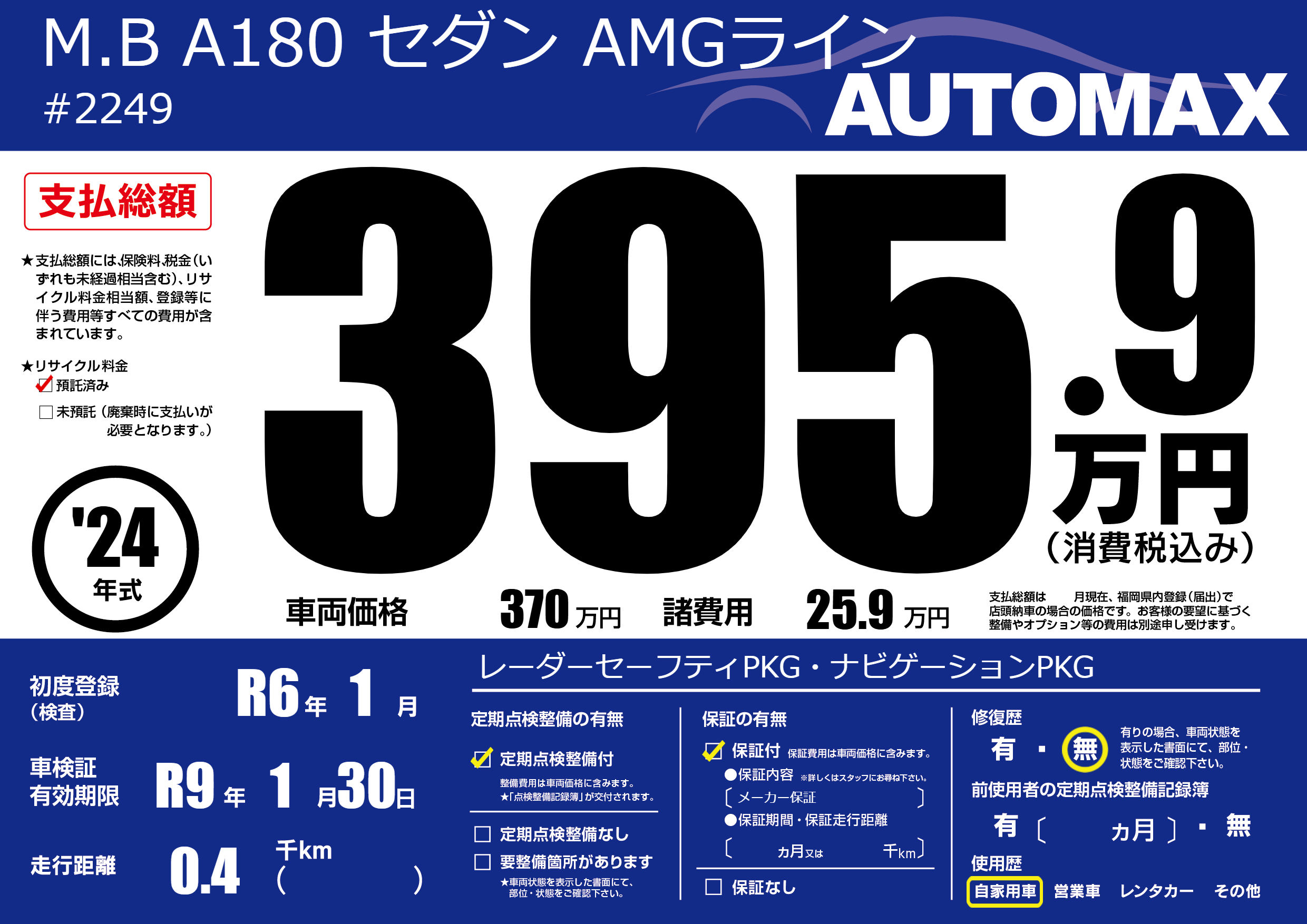 | 車名 | M.B A180 セダン AMGライン | グレード ミッション 排気量 |