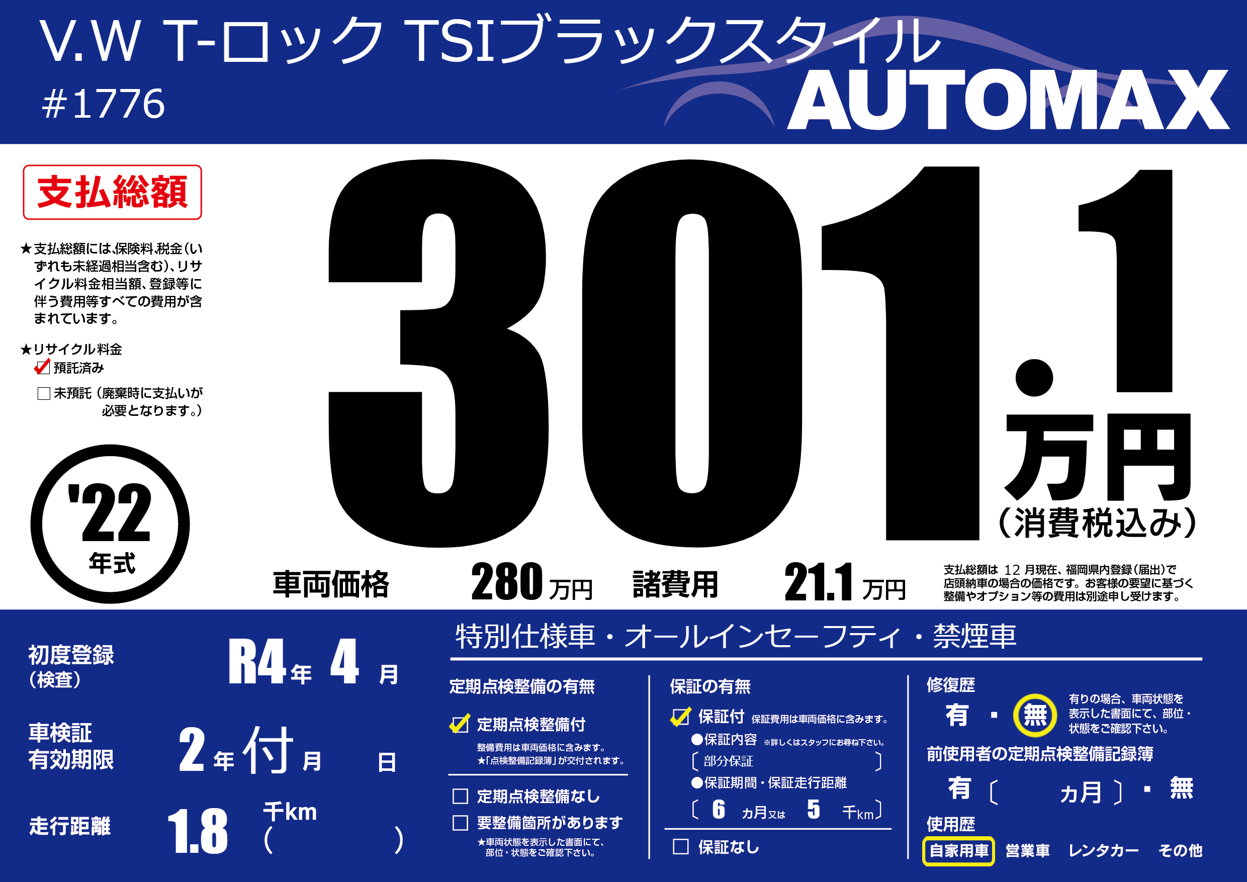 | 車名 | V.W T-ロック TSIブラックスタイル | グレード ミッション 排気量 |