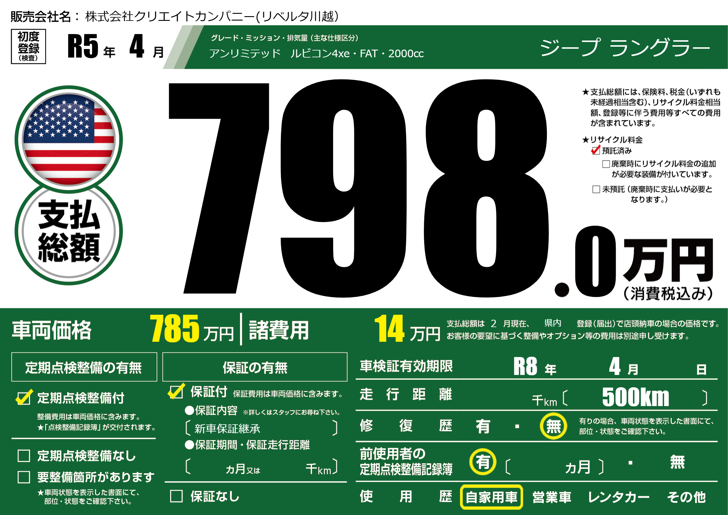 なし | 車検制限 | R8年4月---月 |