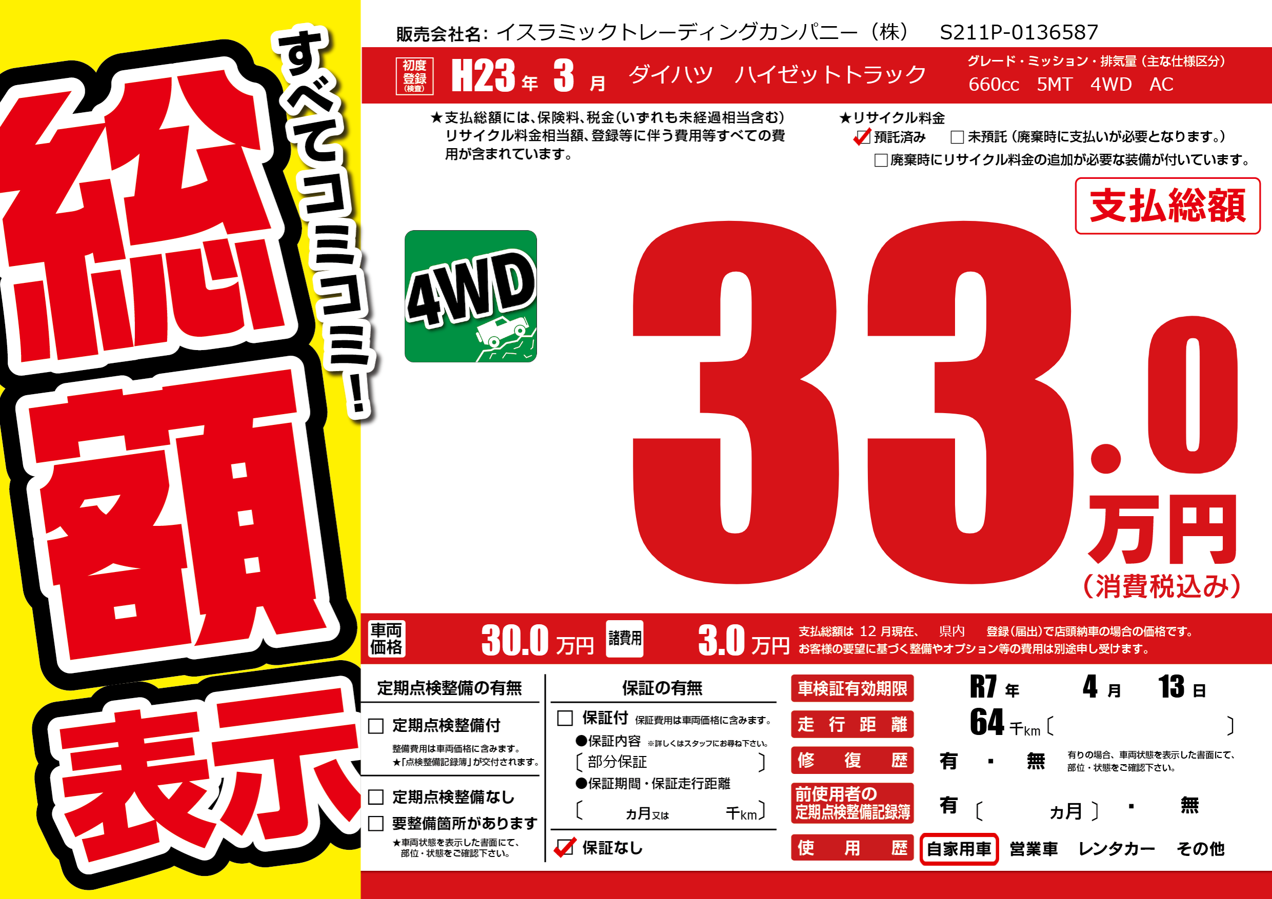 | 車名 | ダイハツ ハイゼットトラック | グレード ミッション 排気量 |