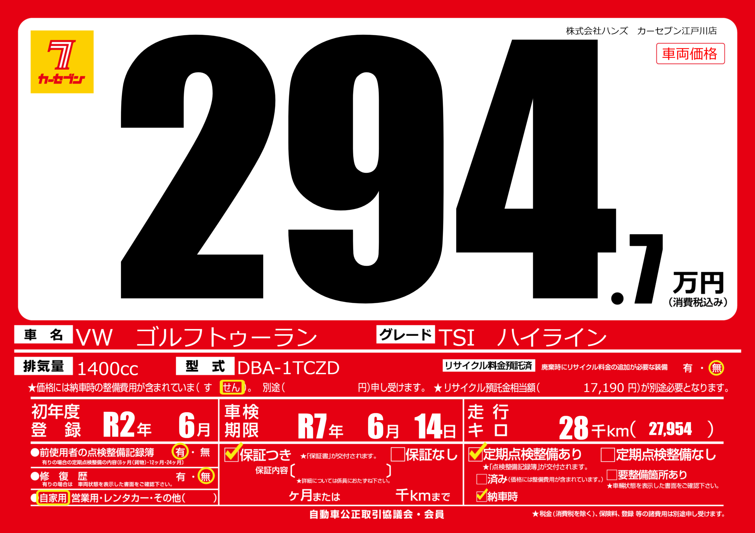 | 走行キロ | 2.8万km | 初年度登録 | R2年6月 |