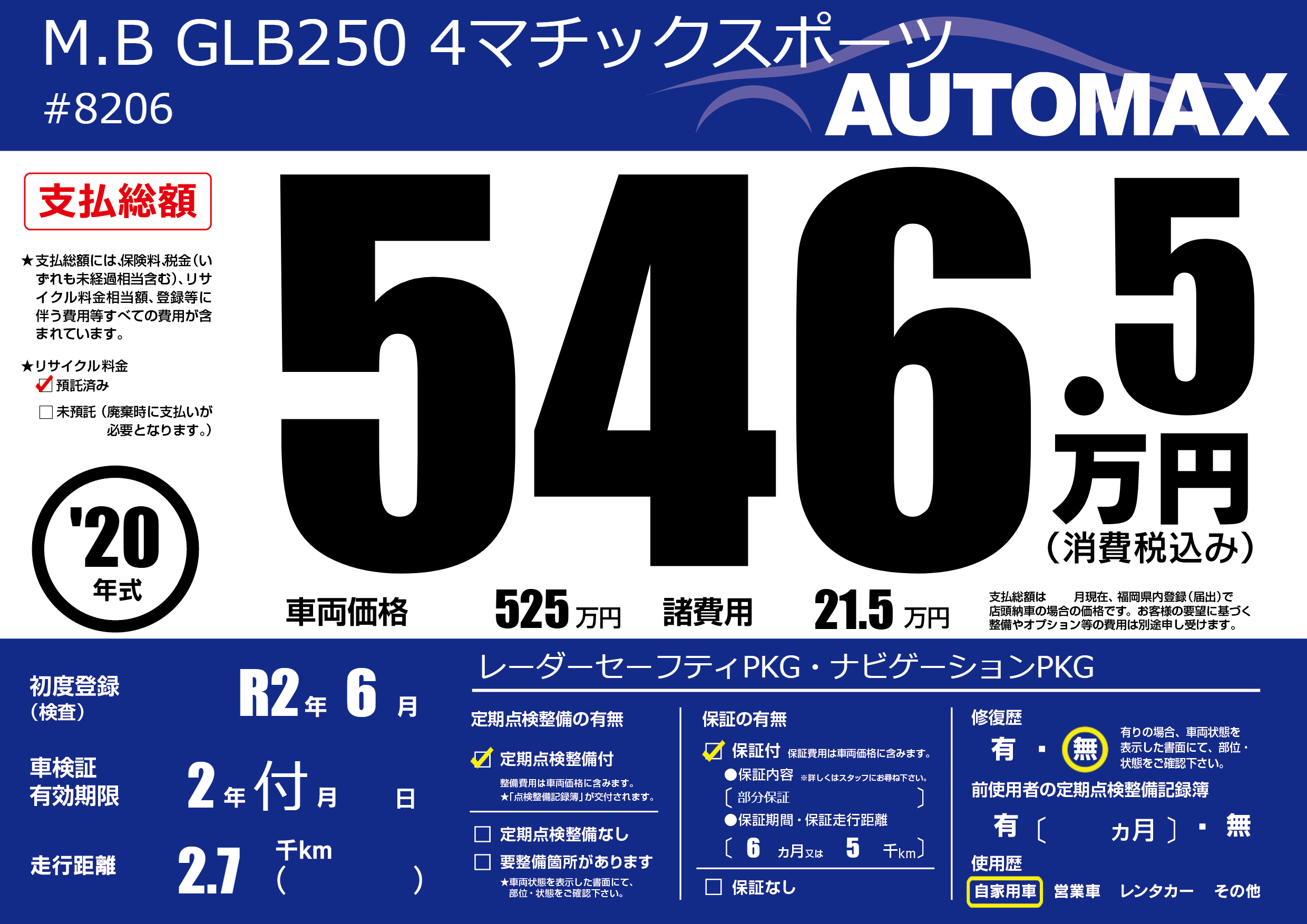 | 車名 | M.B GLB250 4マチックスポーツ | グレード ミッション 排気量 |