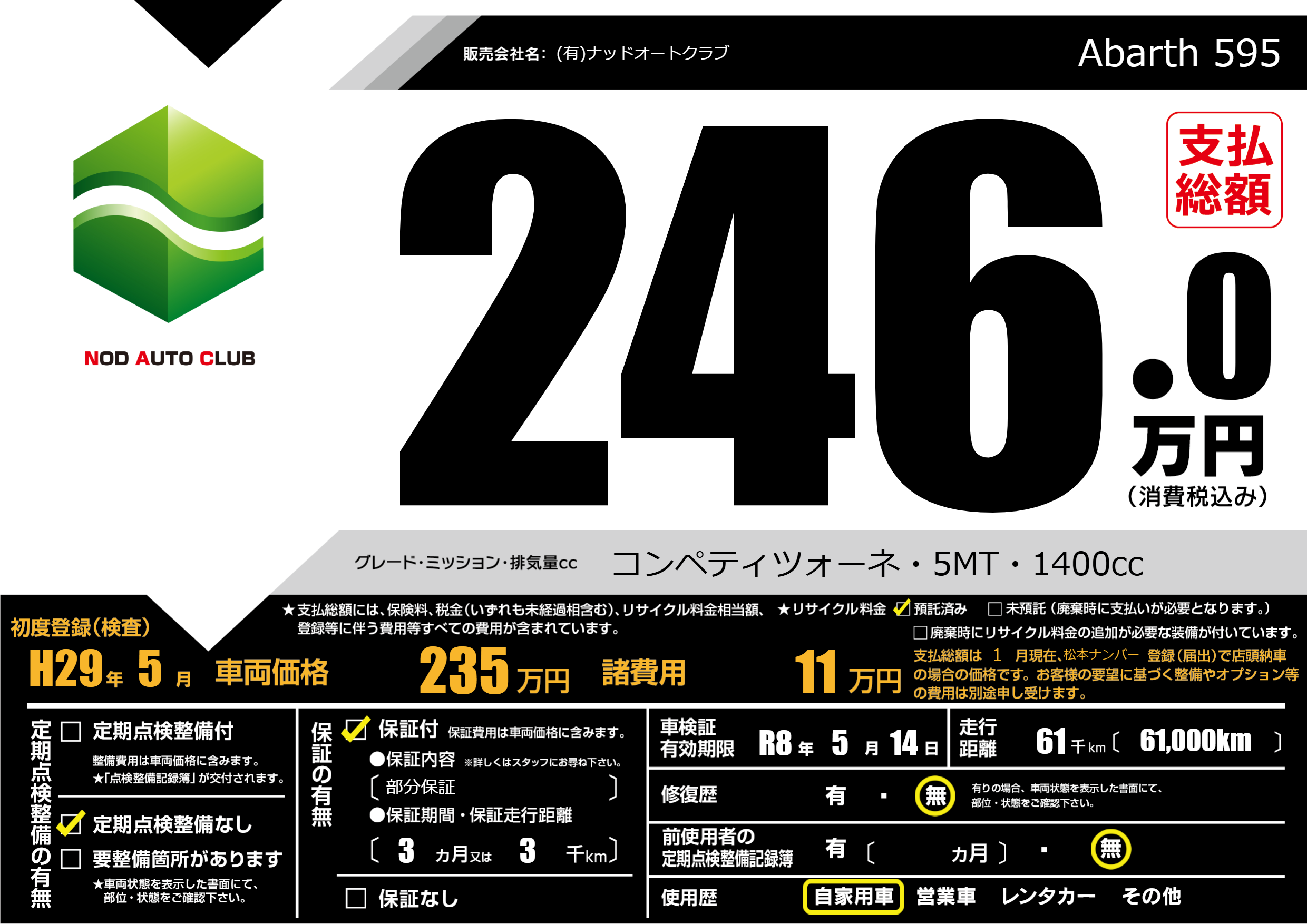 | 車名 | Abarth 595 | グレード ミッション 排気量 |