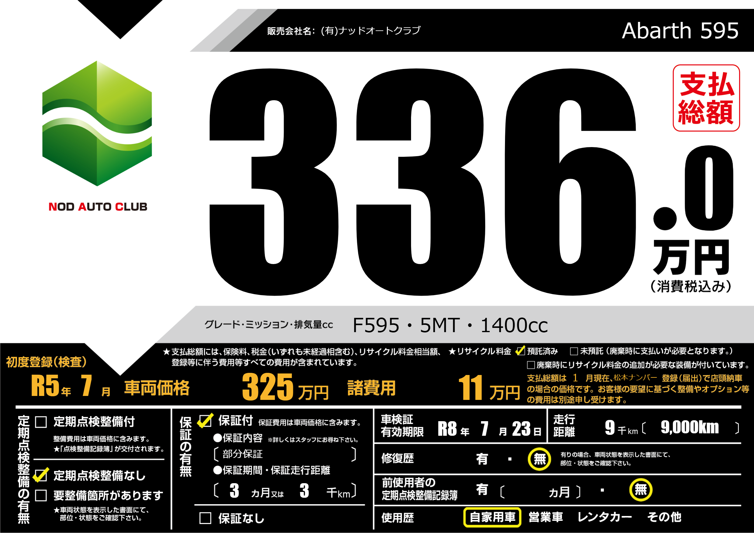 | 車名 | Abarth 595 | グレード ミッション 排気量 |