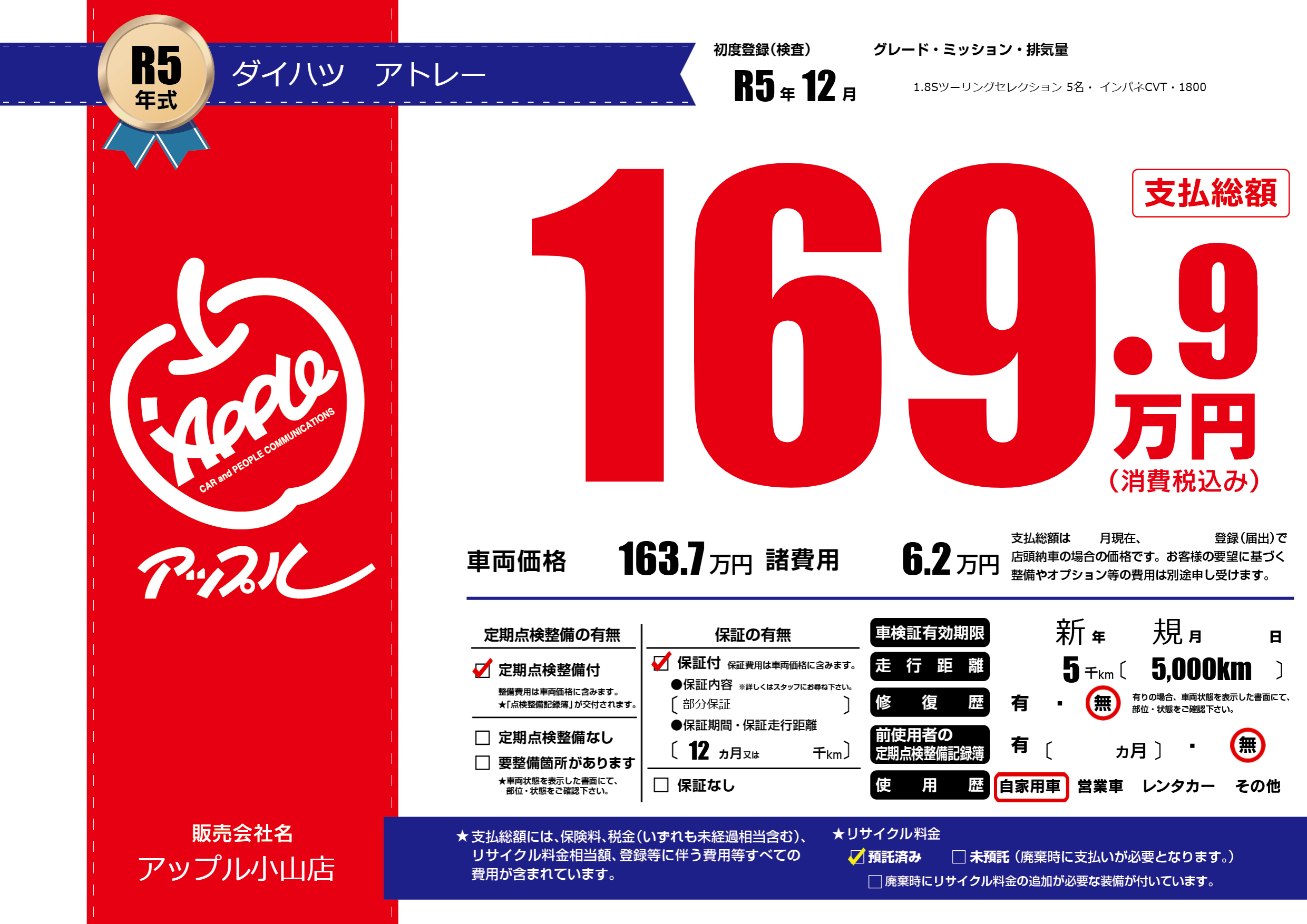 | 走行キロ | 0.5万km | 初年度登録 | R5年12月 |