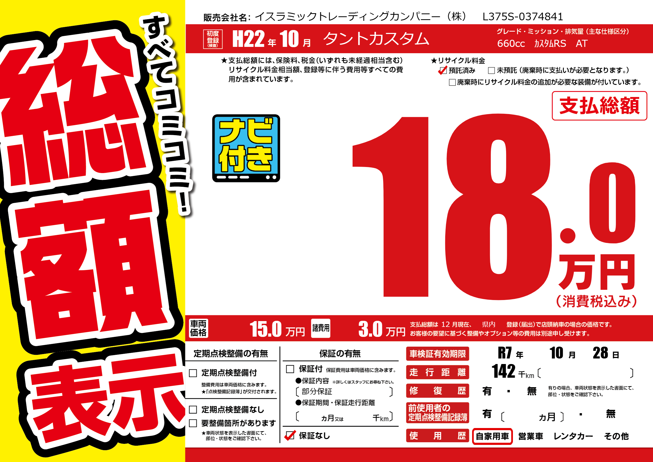 | 車名 | タントカスタム | グレード ミッション 排気量 |