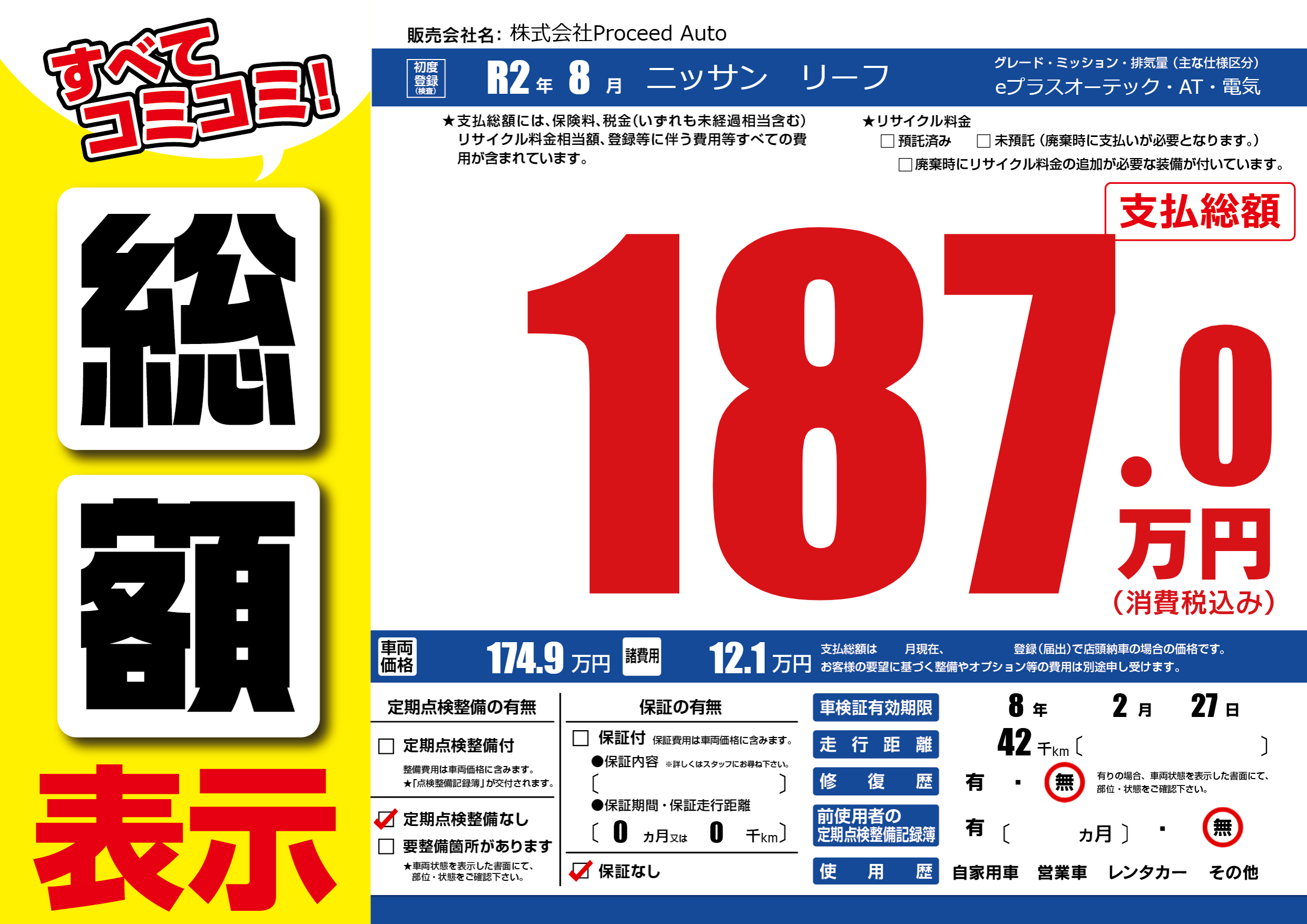 | 車名 | ニッサン リーフ | グレード ミッション 排気量 |