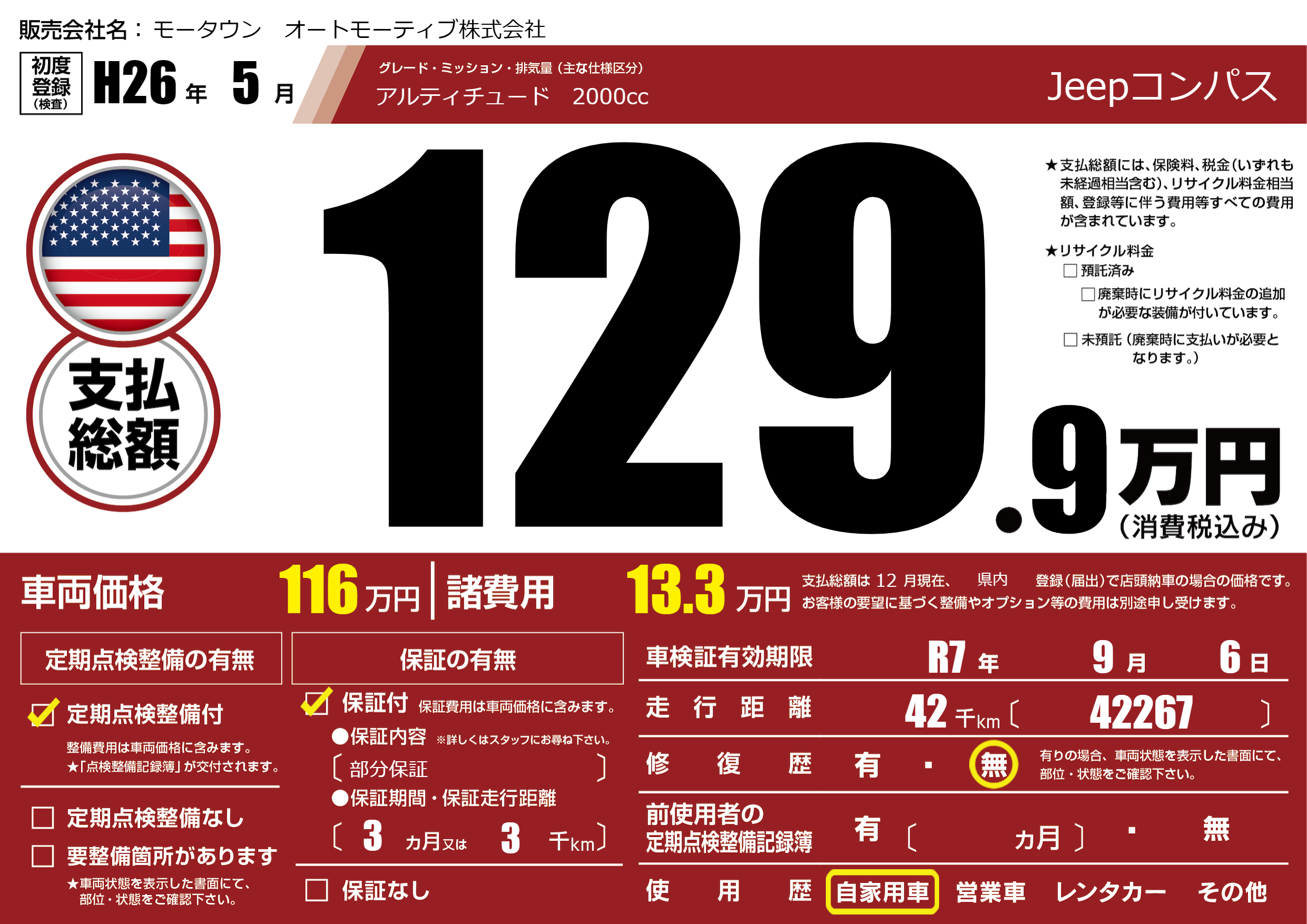 | 車名 | Jeepコンパス | グレード ミッション 排気量 |